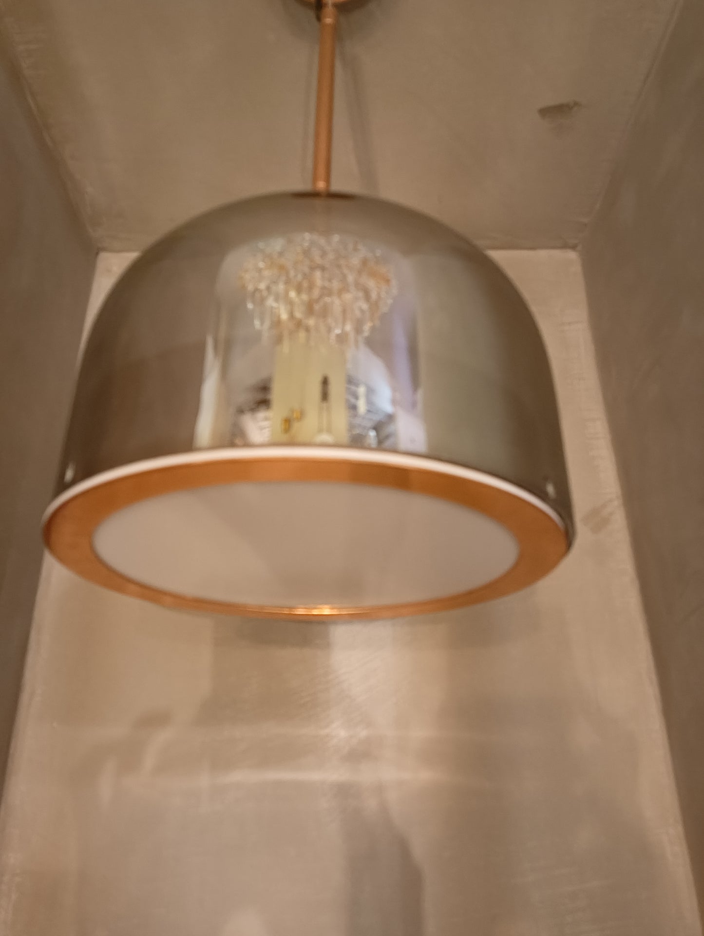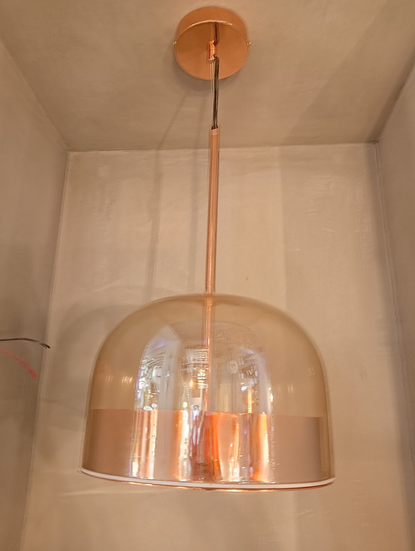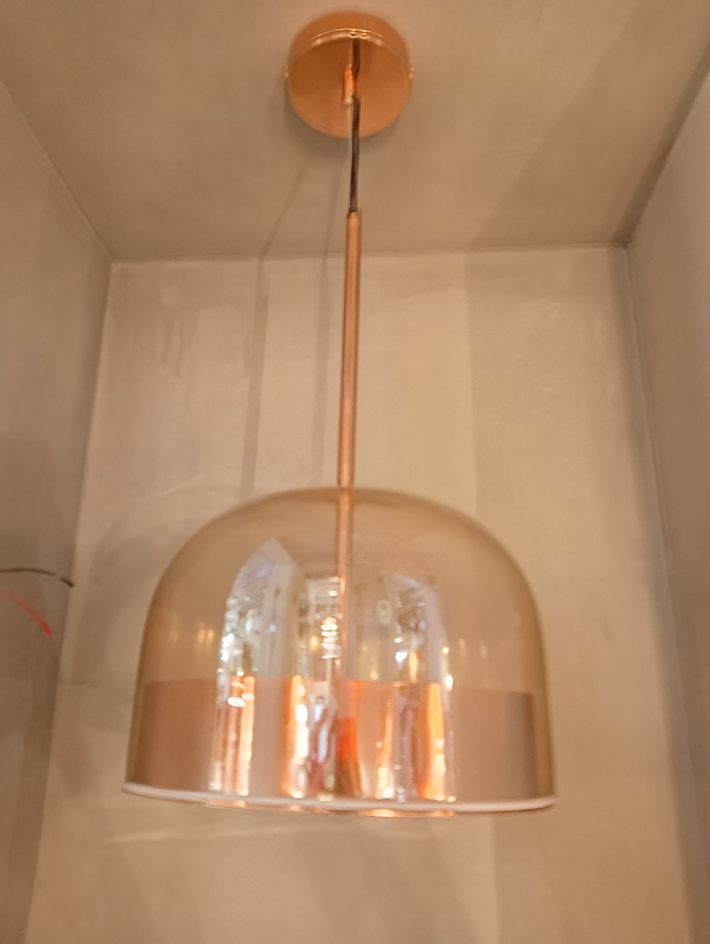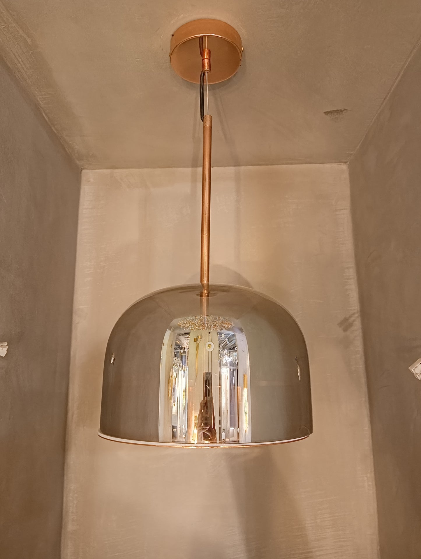 It is designed to bring elegance and warmth into your interiors. Crafted from glass and metal, it combines durability with a refined look. Available in amber or gray body colors, this pendant casts a soft warm white glow through its in-built LED, adding charm to dining spaces, living rooms, or bedrooms. With dimensions of D230 x H430 mm, it balances style and subtlety, making it a versatile centerpiece for modern homes.