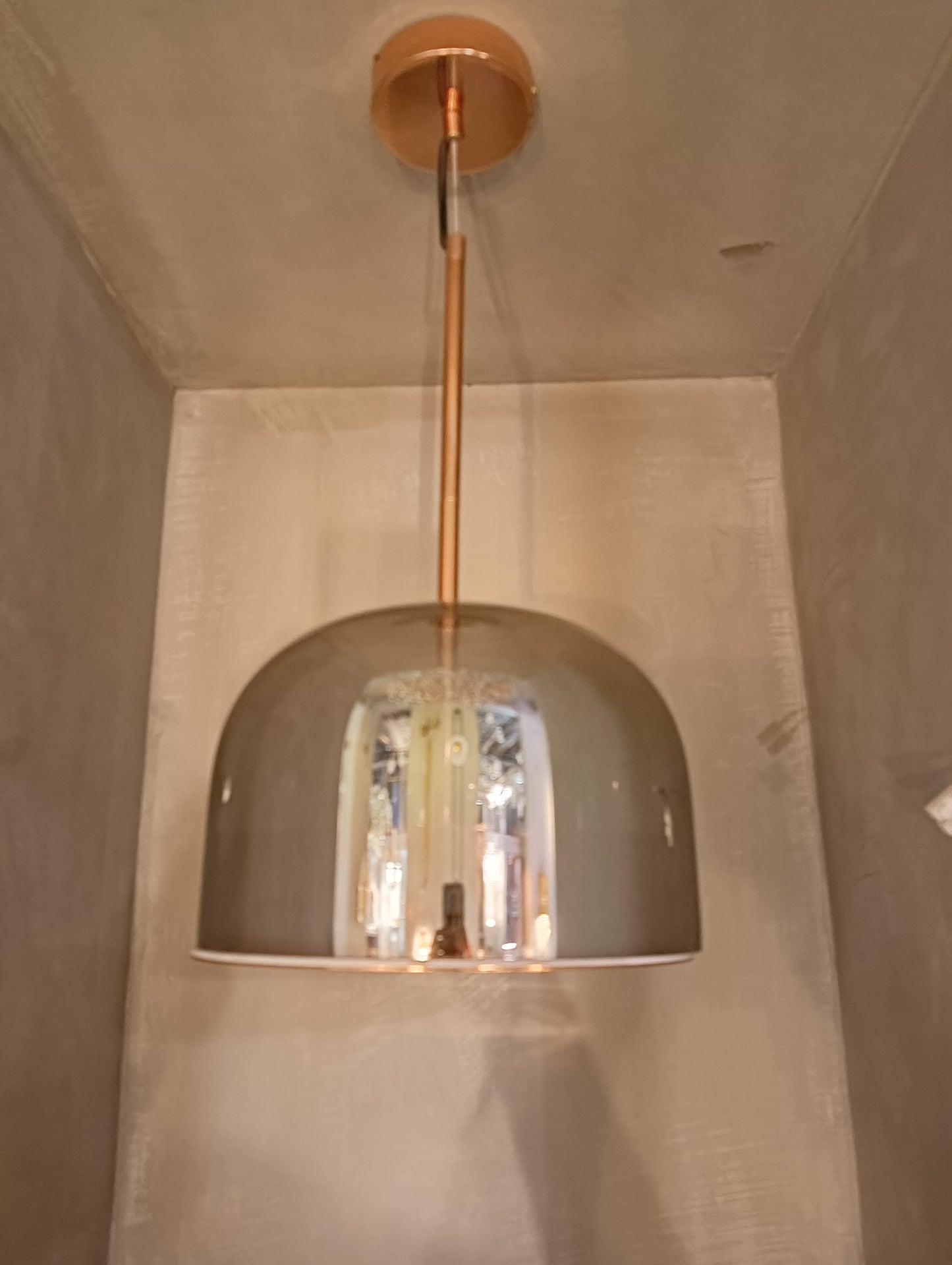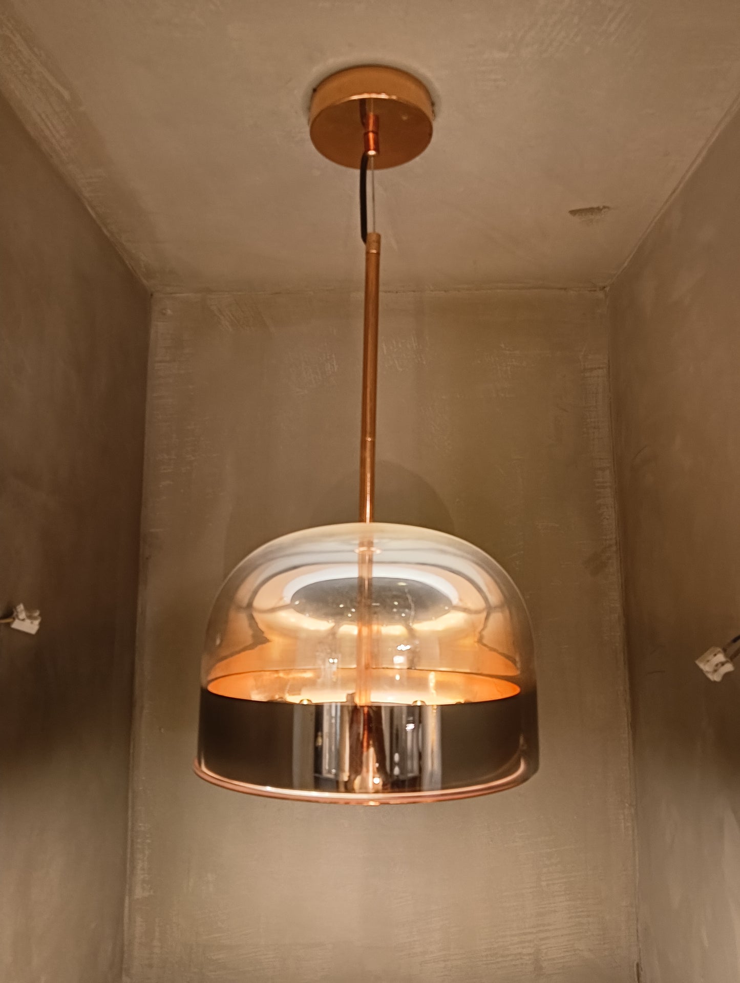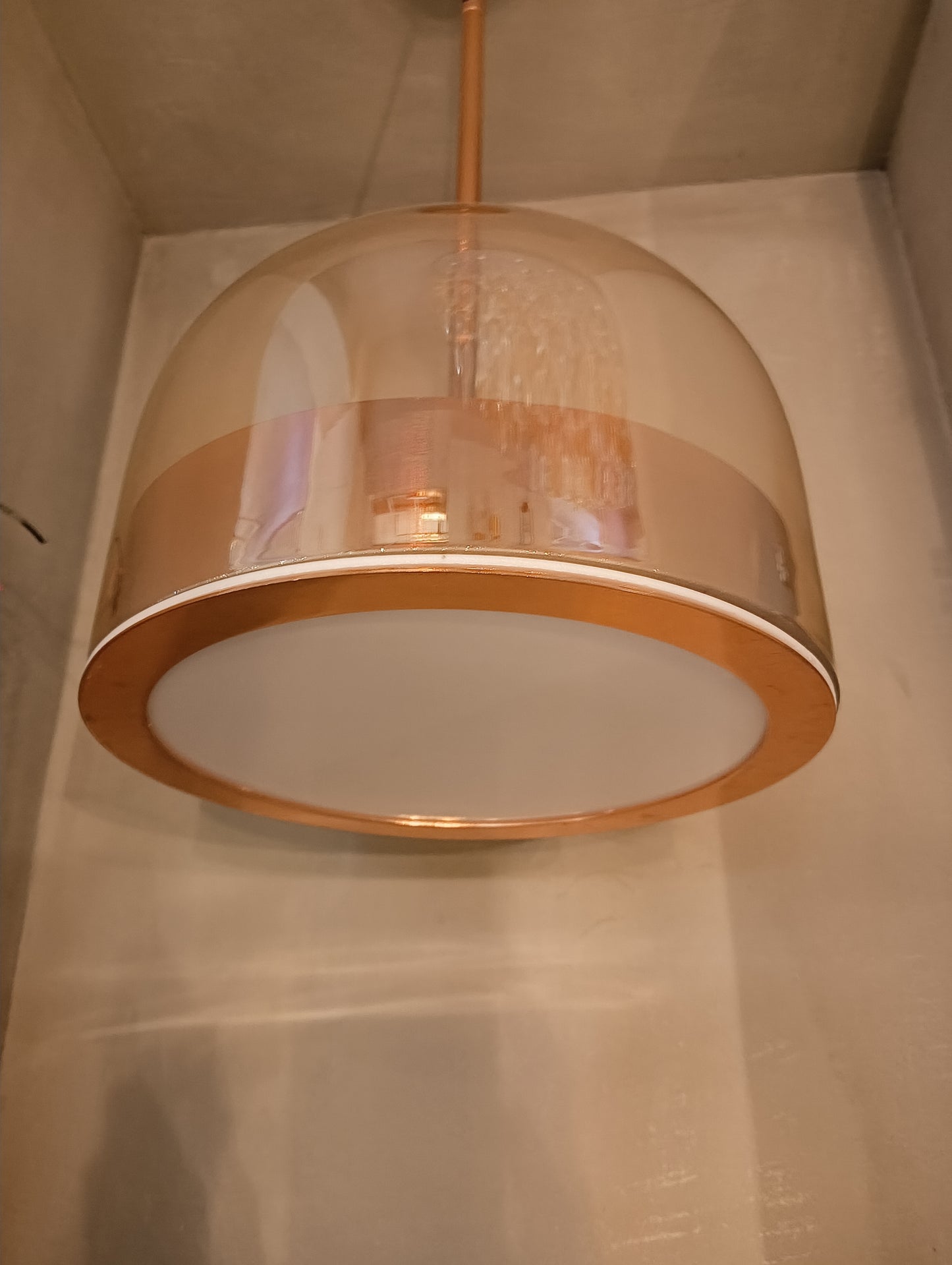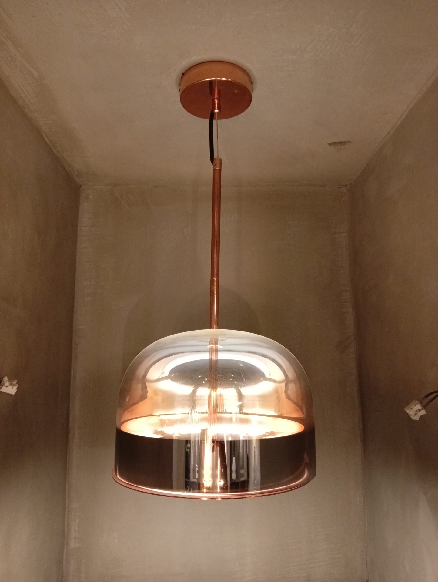 It is designed to bring elegance and warmth into your interiors. Crafted from glass and metal, it combines durability with a refined look. Available in amber or gray body colors, this pendant casts a soft warm white glow through its in-built LED, adding charm to dining spaces, living rooms, or bedrooms. With dimensions of D230 x H430 mm, it balances style and subtlety, making it a versatile centerpiece for modern homes.