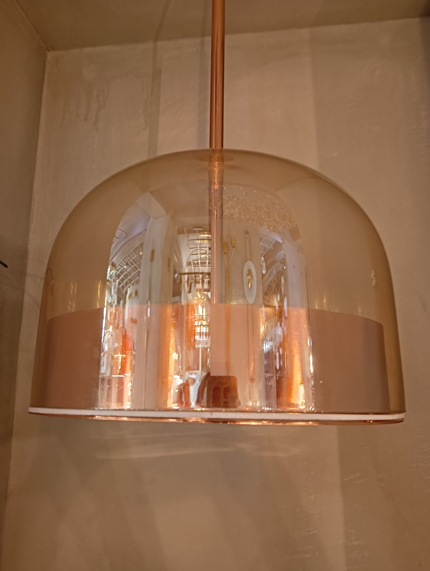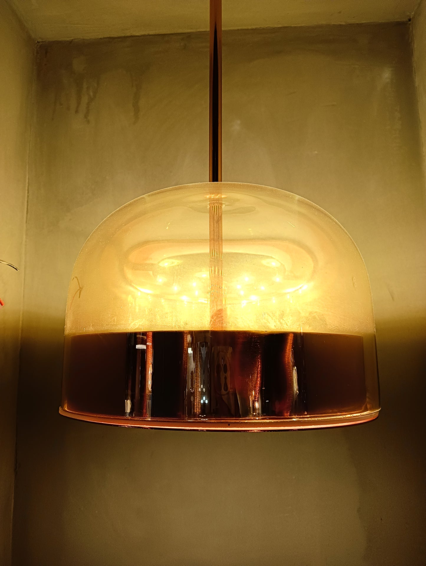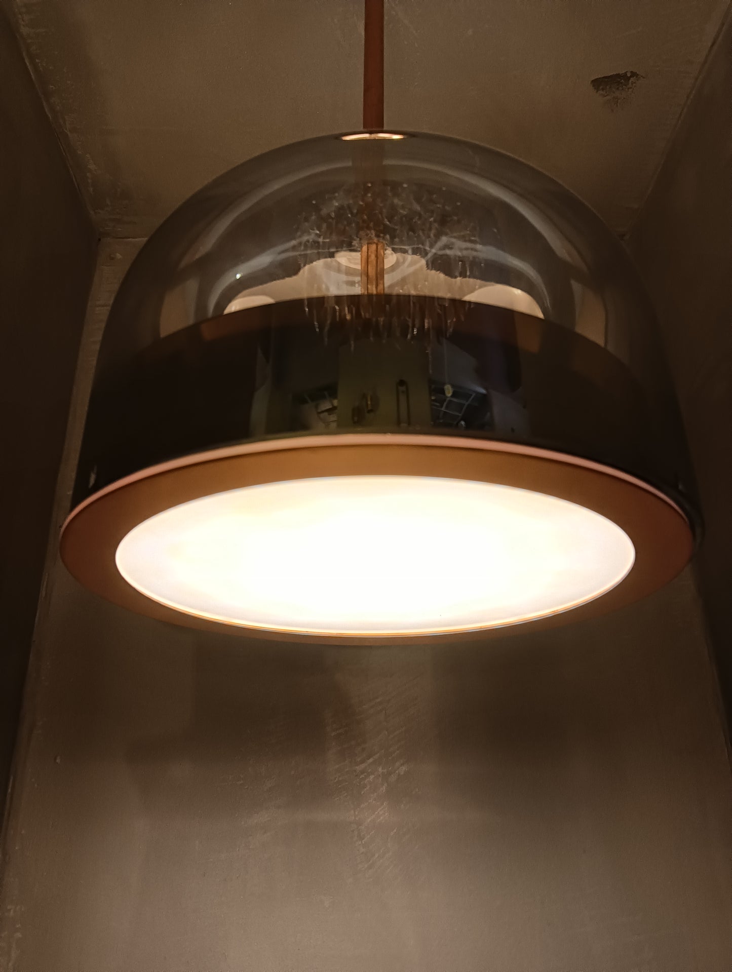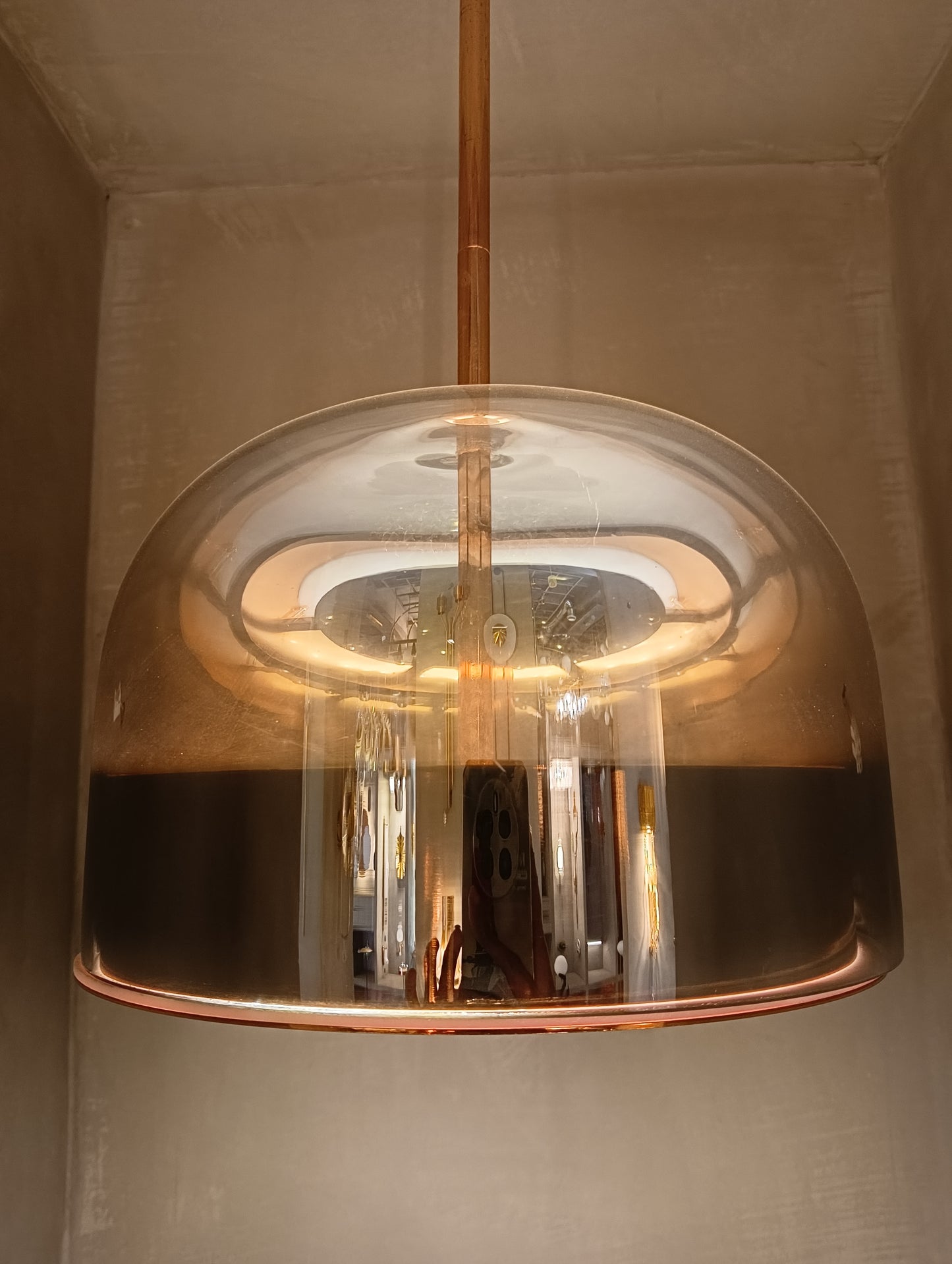 It is designed to bring elegance and warmth into your interiors. Crafted from glass and metal, it combines durability with a refined look. Available in amber or gray body colors, this pendant casts a soft warm white glow through its in-built LED, adding charm to dining spaces, living rooms, or bedrooms. With dimensions of D230 x H430 mm, it balances style and subtlety, making it a versatile centerpiece for modern homes.