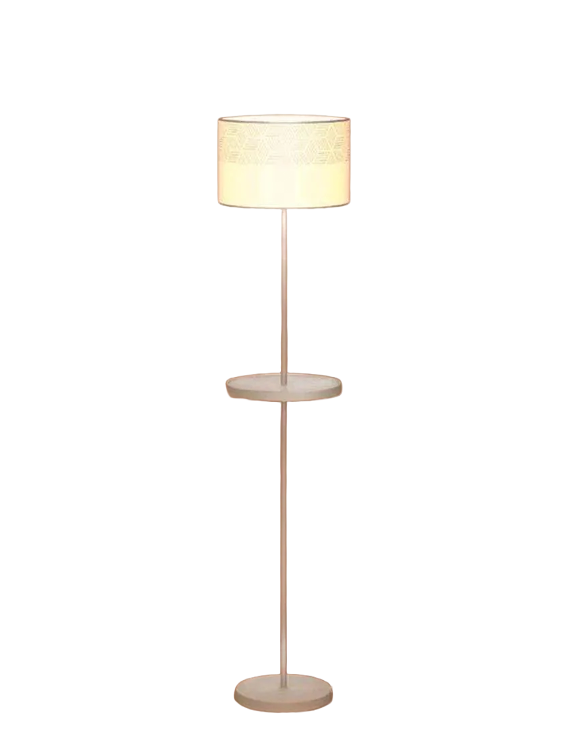A fabric shade diffuses light softly for a warm, ambient glow.