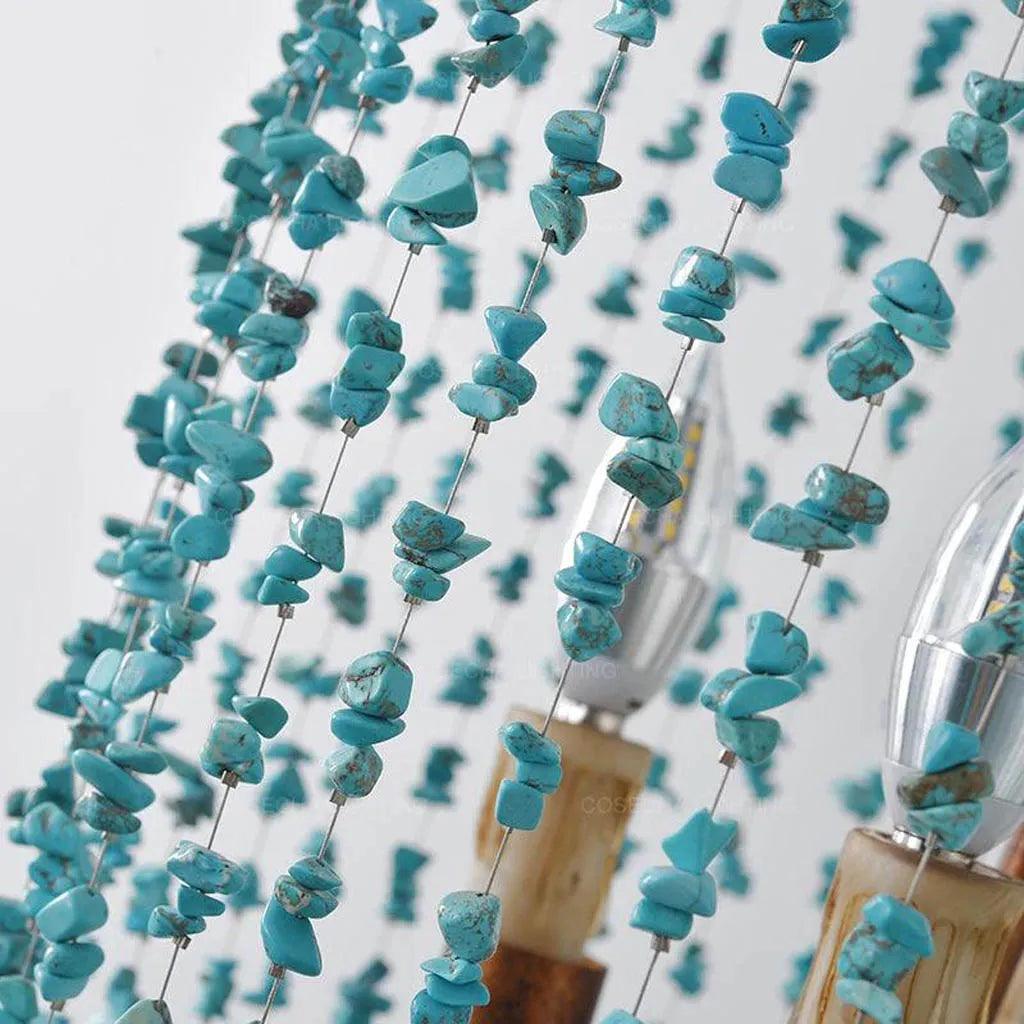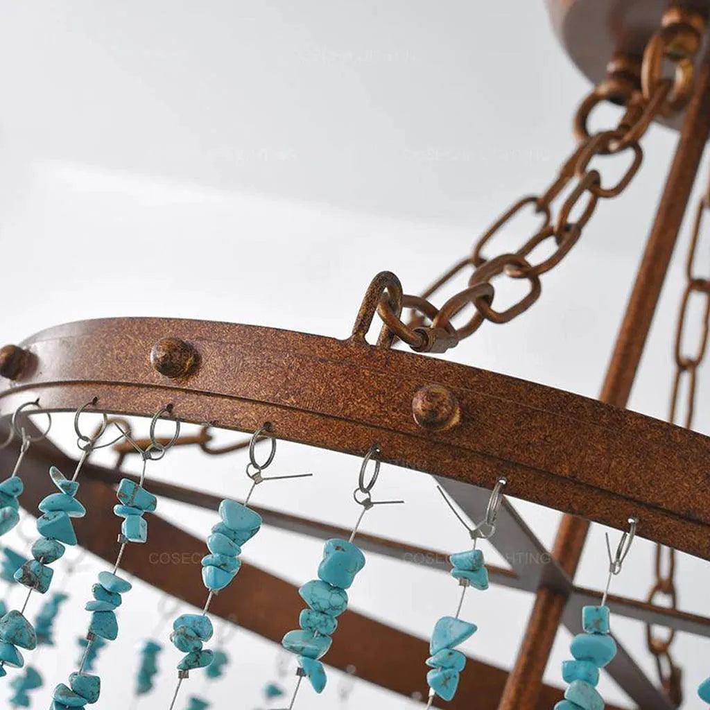 The Aqua Gem Bohemian Look Antique Vintage Chandelier embodies timeless elegance with its intricate design. It blends vintage charm with contemporary sophistication. The chandelier features an exquisite arrangement of turquoise stone accents. These accents rest gracefully on sleek iron frames, enhancing its unique aesthetic.