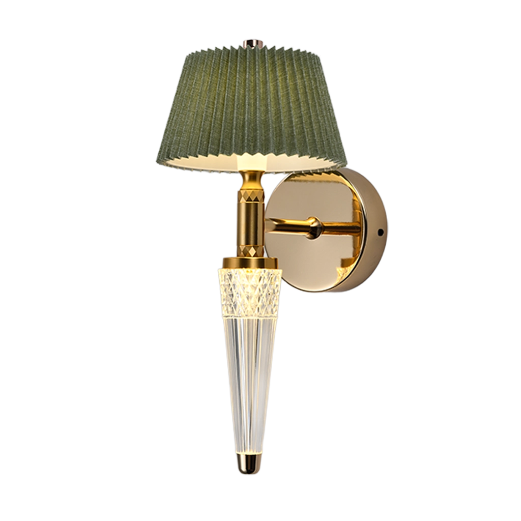 Aurex Pleated is guided by softness and repetition. The pleated fabric shade filters light gradually, introducing rhythm through folds rather than surface texture. Illumination feels muted and settled, shaped by fabric behaviour instead of intensity. The gold-toned structure remains restrained, serving as a quiet frame to the textile form. Light is resolved through layering and cadence, producing a calm, measured presence without visual weight.