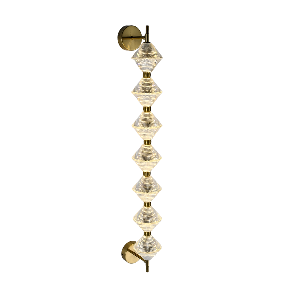 Aurex Stacked is structured through vertical build-up and separation. Individual acrylic elements are arranged in sequence, allowing light to pass through layers with subtle interruption. The result is illumination that feels segmented yet cohesive, shaped by depth rather than spread. The gold-toned frame remains restrained, holding the composition together without emphasis. Light is resolved through accumulation and spacing, creating a measured presence defined by structure and order.