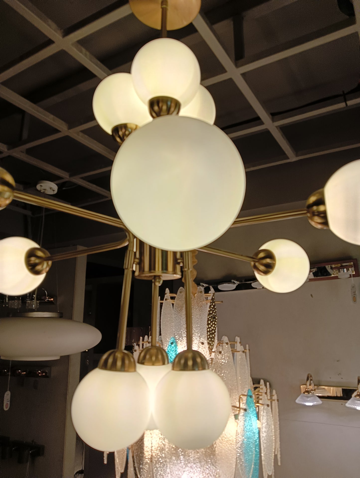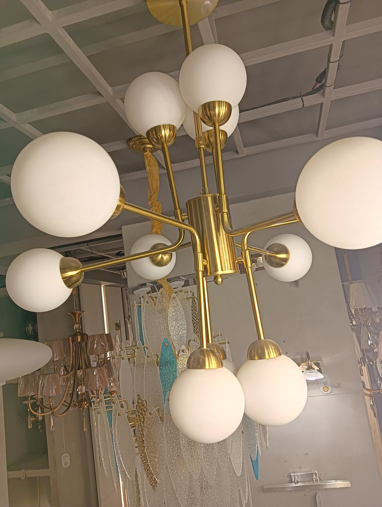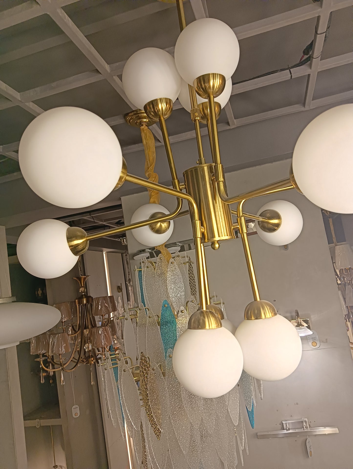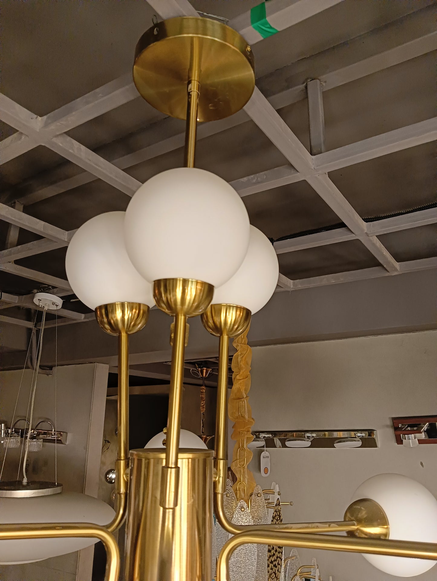 Displays a timeless design with its antique gold body and shimmering glass balls. Measuring L760 × H860 mm, it features 12 glass spheres (3" size) that emit a warm white glow, creating a refined and inviting ambiance. Supported by durable metal construction with G9 bulb holders, this chandelier combines elegance and functionality, making it perfect for living rooms, dining spaces, or upscale interiors seeking a blend of classic and modern charm.