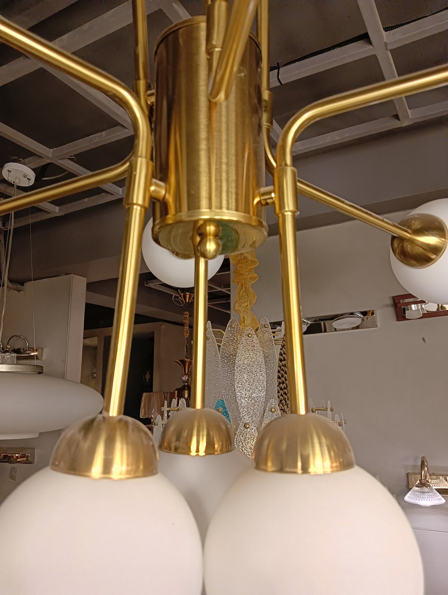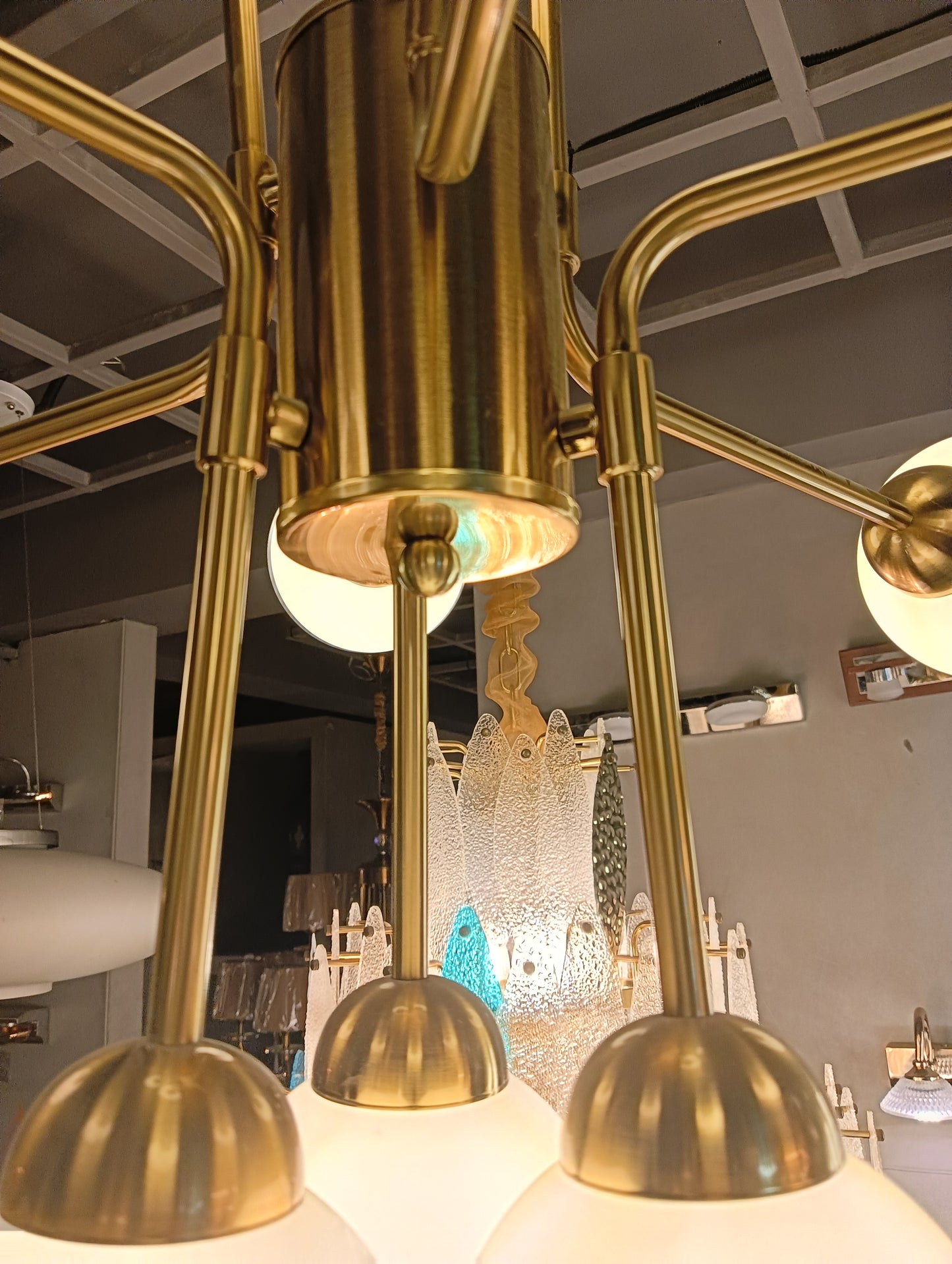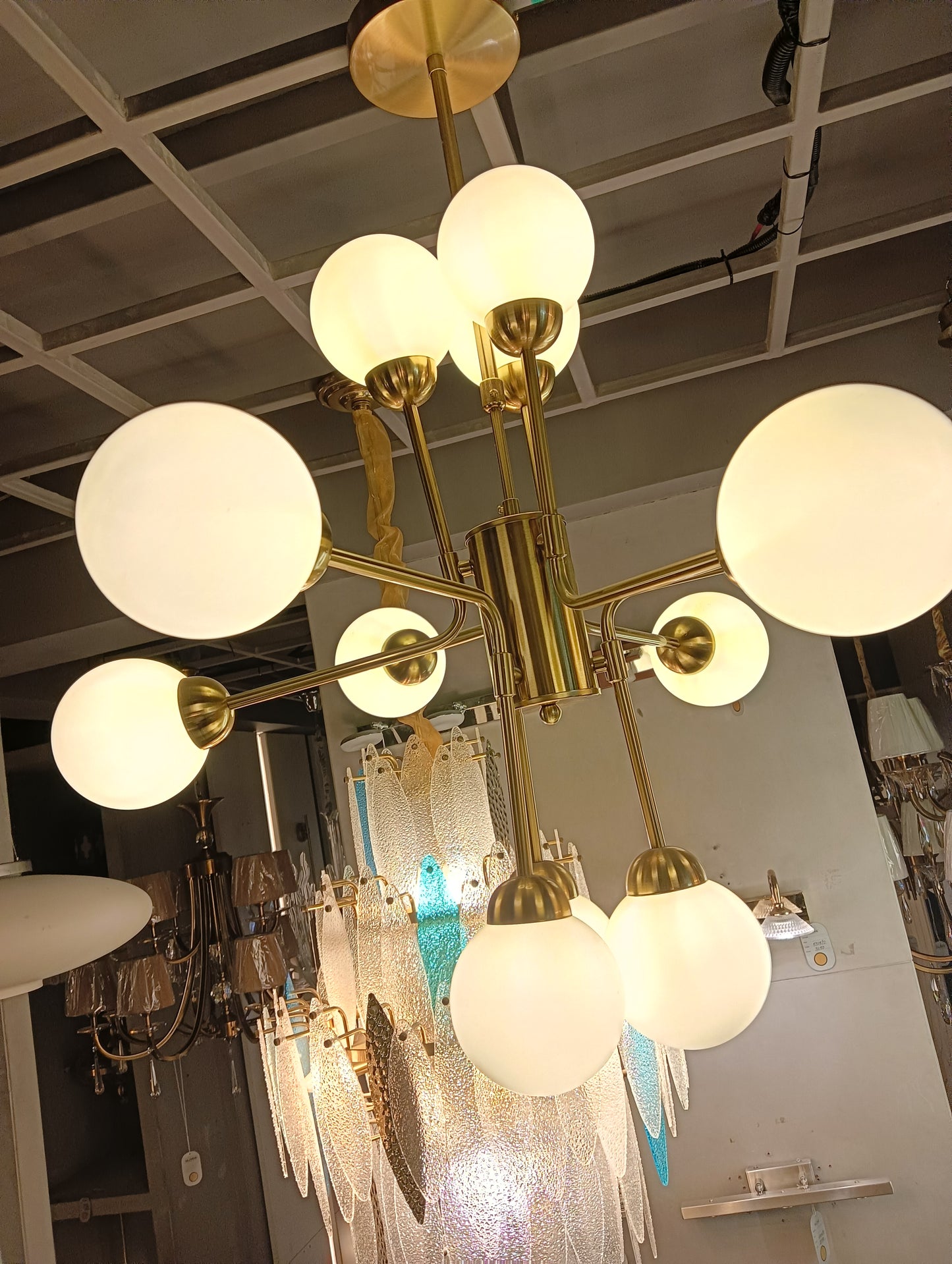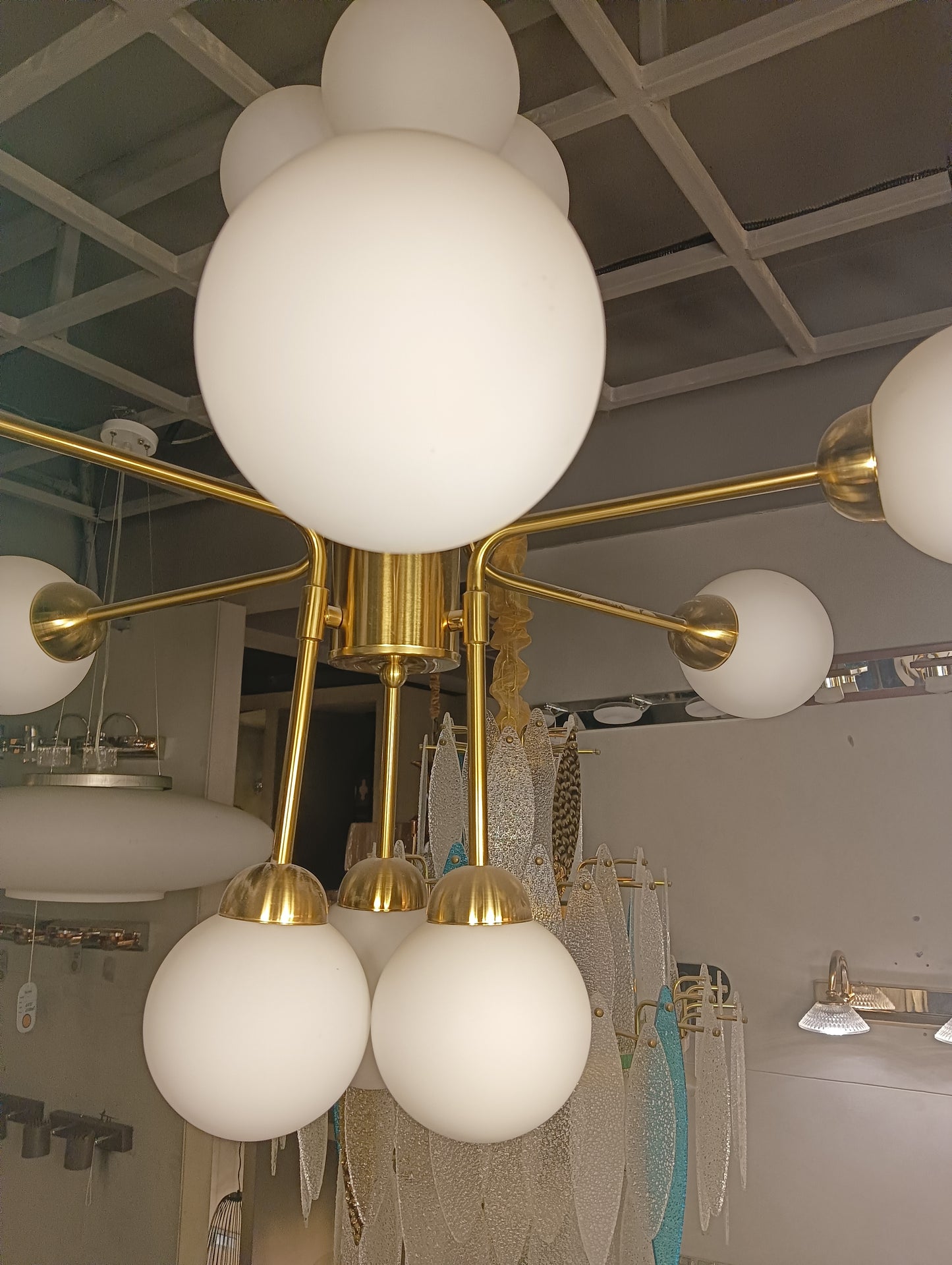 Displays a timeless design with its antique gold body and shimmering glass balls. Measuring L760 × H860 mm, it features 12 glass spheres (3" size) that emit a warm white glow, creating a refined and inviting ambiance. Supported by durable metal construction with G9 bulb holders, this chandelier combines elegance and functionality, making it perfect for living rooms, dining spaces, or upscale interiors seeking a blend of classic and modern charm.