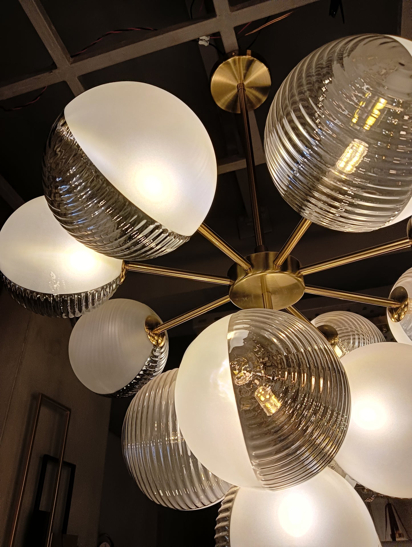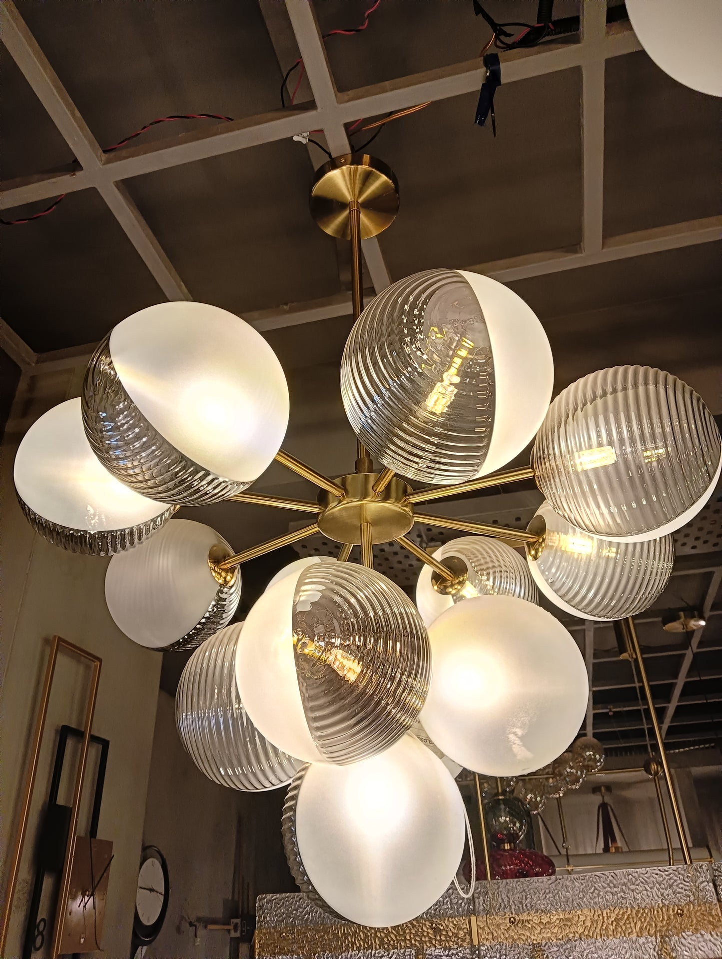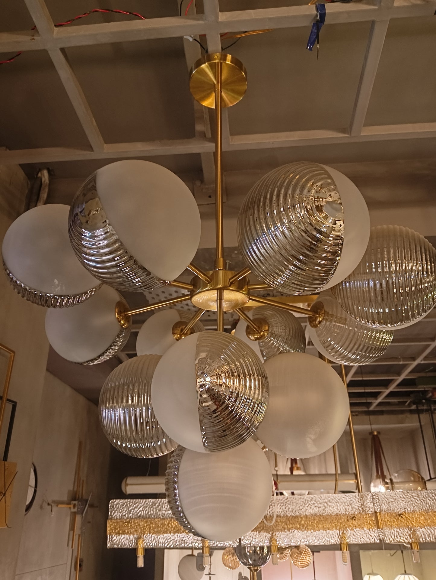 It is a refined balance of elegance and modern charm. Featuring iron and glass construction in a soft white and gray finish, it holds 13 G9 bulbs to emit a warm, inviting glow. Measuring 650 × 650 mm, this chandelier is compact yet impactful, making it perfect for dining rooms, bedrooms, or boutique spaces. Its luminous glass spheres resemble glowing moons, bringing celestial beauty into contemporary interiors.