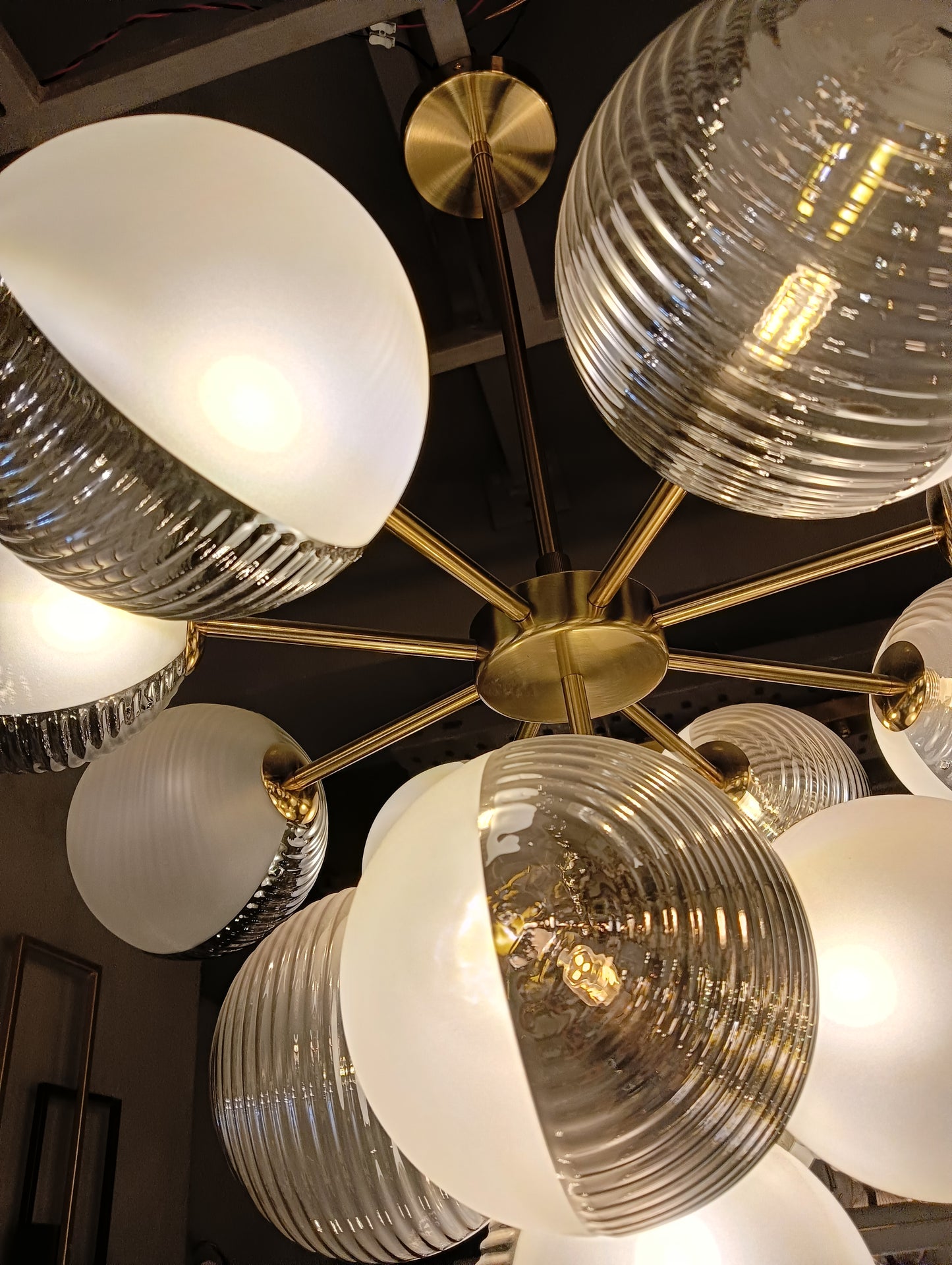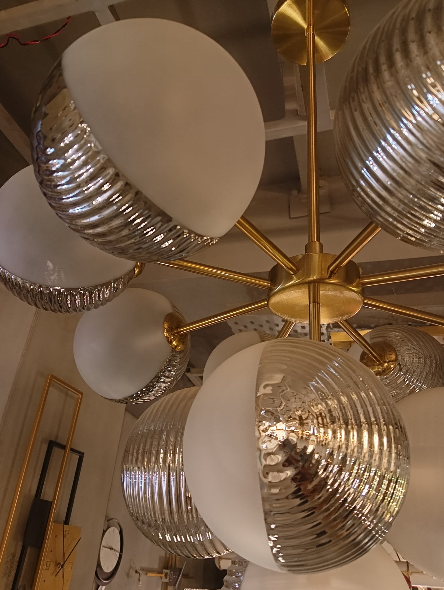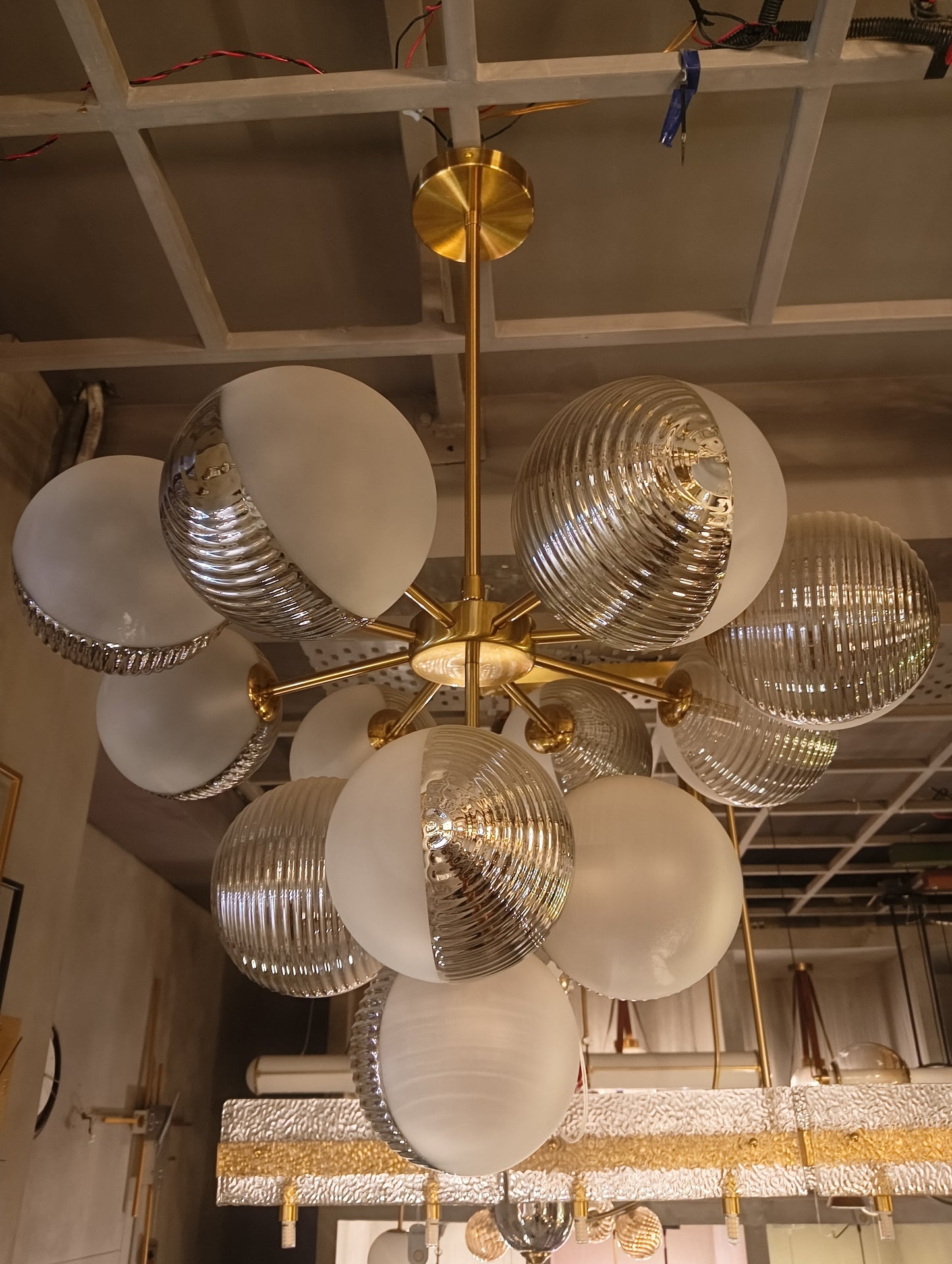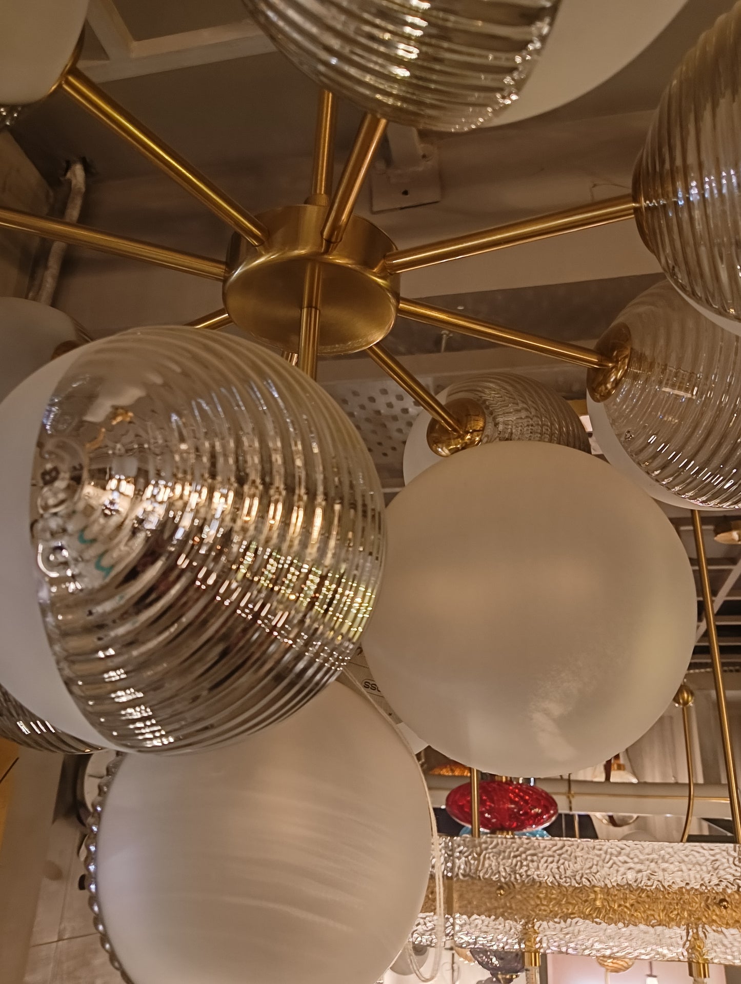It is a refined balance of elegance and modern charm. Featuring iron and glass construction in a soft white and gray finish, it holds 13 G9 bulbs to emit a warm, inviting glow. Measuring 650 × 650 mm, this chandelier is compact yet impactful, making it perfect for dining rooms, bedrooms, or boutique spaces. Its luminous glass spheres resemble glowing moons, bringing celestial beauty into contemporary interiors.