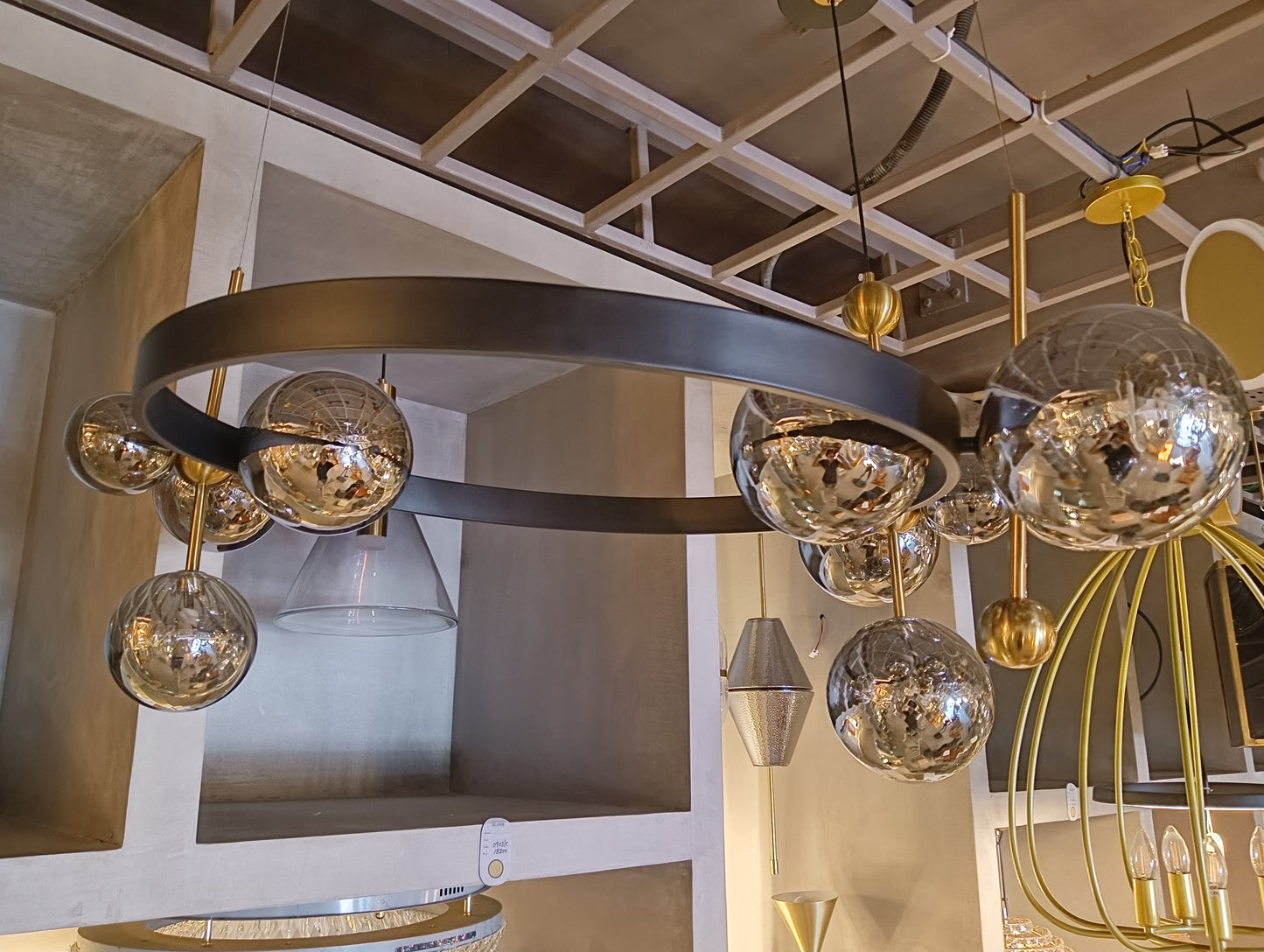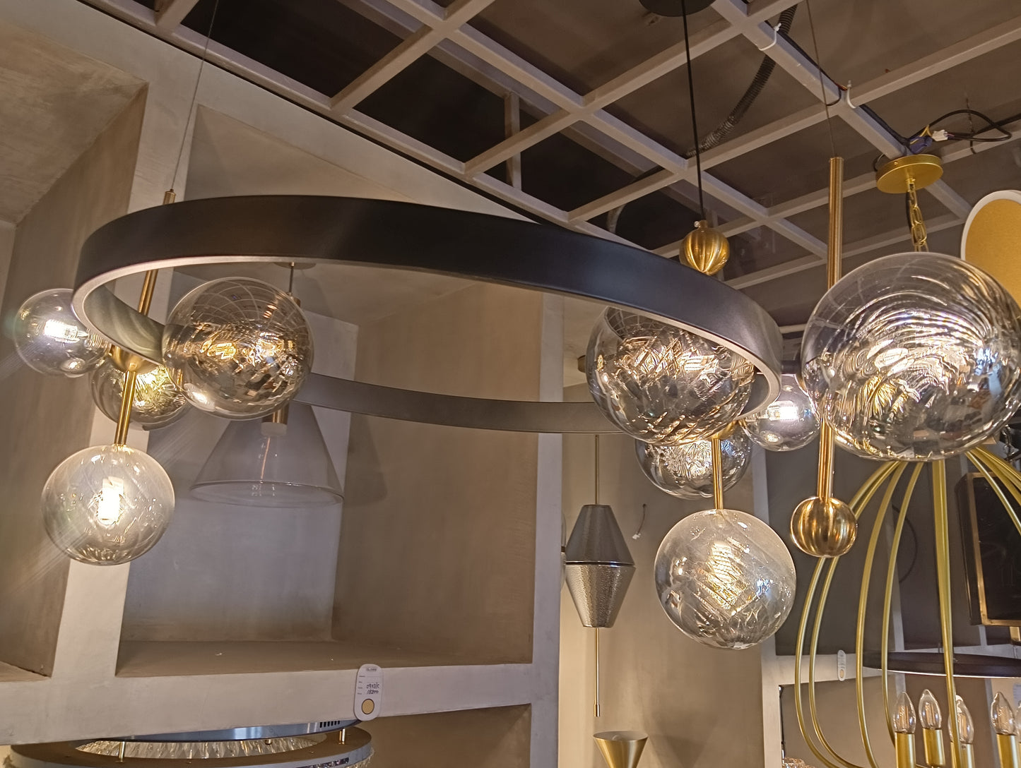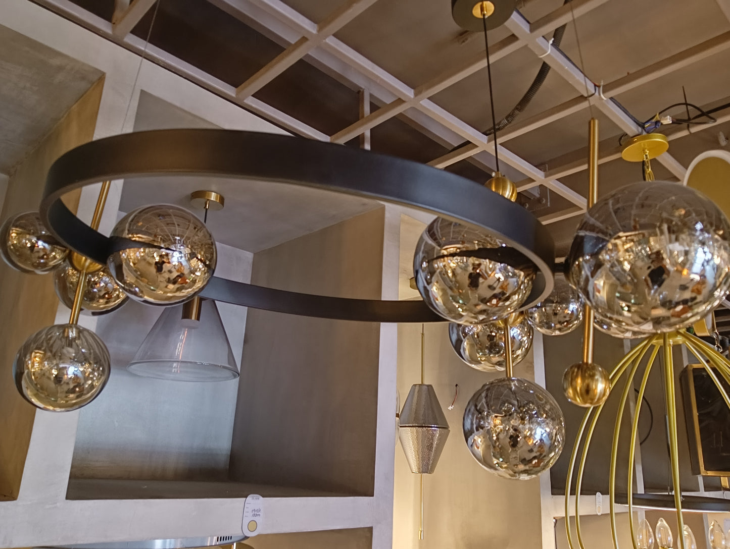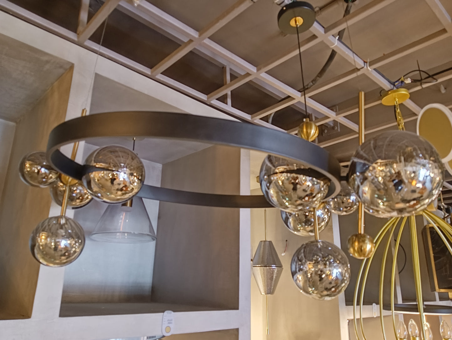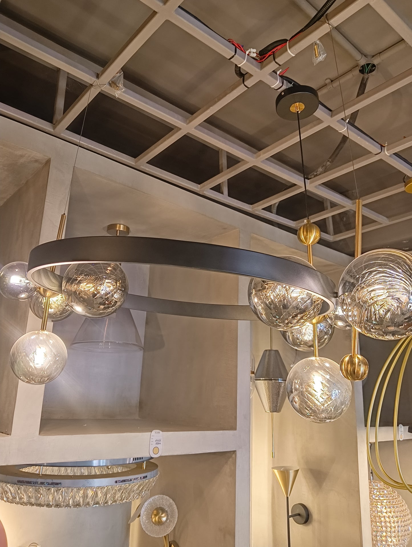 Blends modern elegance with bold geometry. Designed with a sleek black ring accented by smoky glass orbs in varying sizes (90/120/150 mm), it radiates warm white light with 10 × 3W G4 bulbs. Measuring D970 × H470 mm, this chandelier creates a stunning focal point for living rooms, dining spaces, and contemporary interiors. Its black and gold accents highlight sophistication while the glowing spheres add depth and dimension.