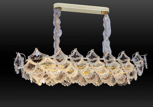 Crystal Arc is defined by directional flow. The elongated arc carries light across a continuous curve, allowing crystal elements to refract illumination progressively rather than concentrically. This creates a sense of movement and visual depth without relying on symmetry. Light feels guided rather than dispersed, shaped by curvature and alignment. The chandelier functions as a spatial gesture, ideal for elongated dining tables or linear ceiling compositions where continuity is more important than central focus.