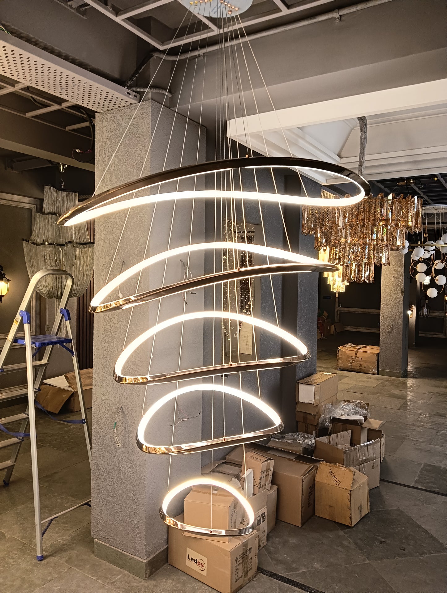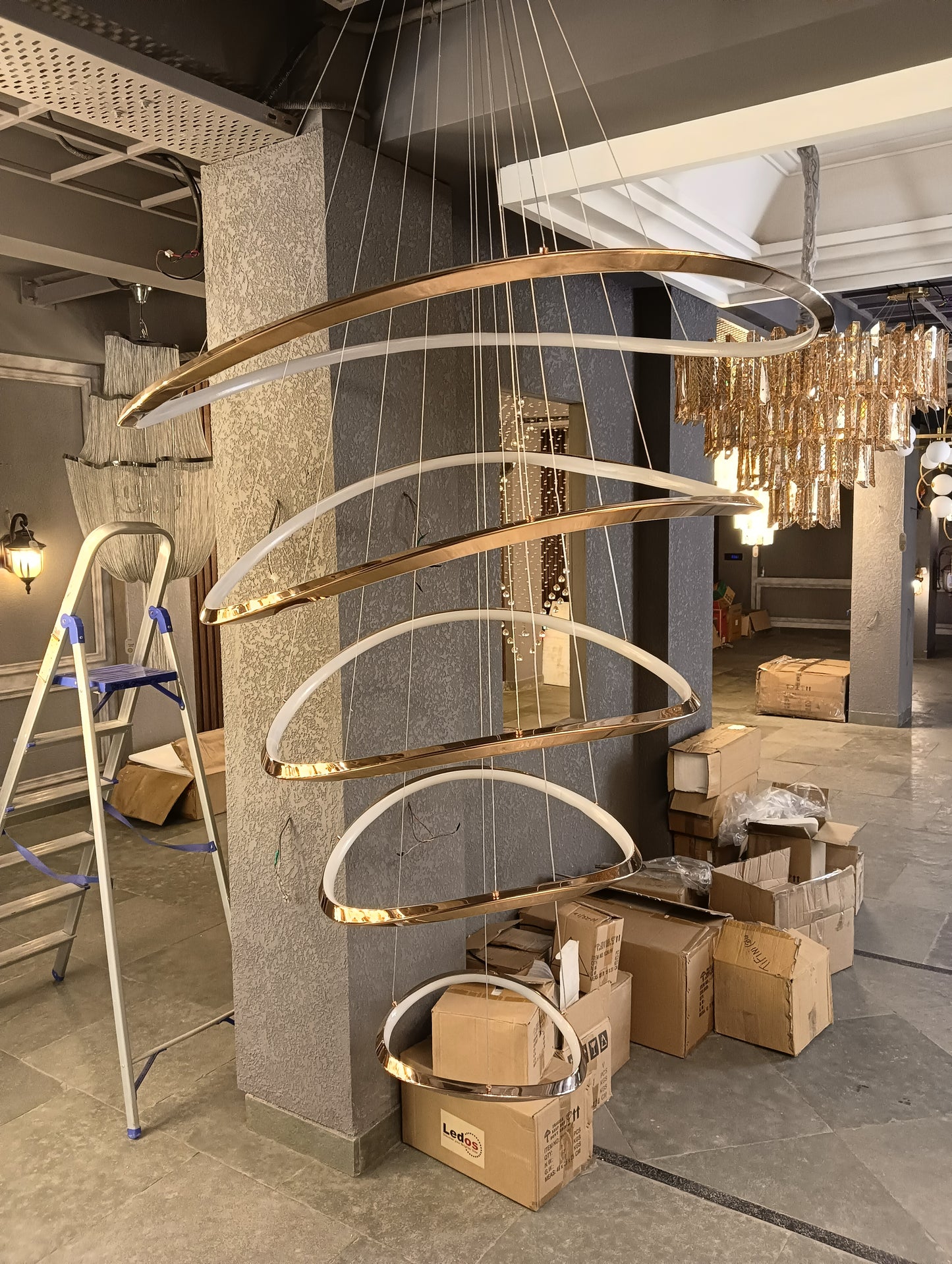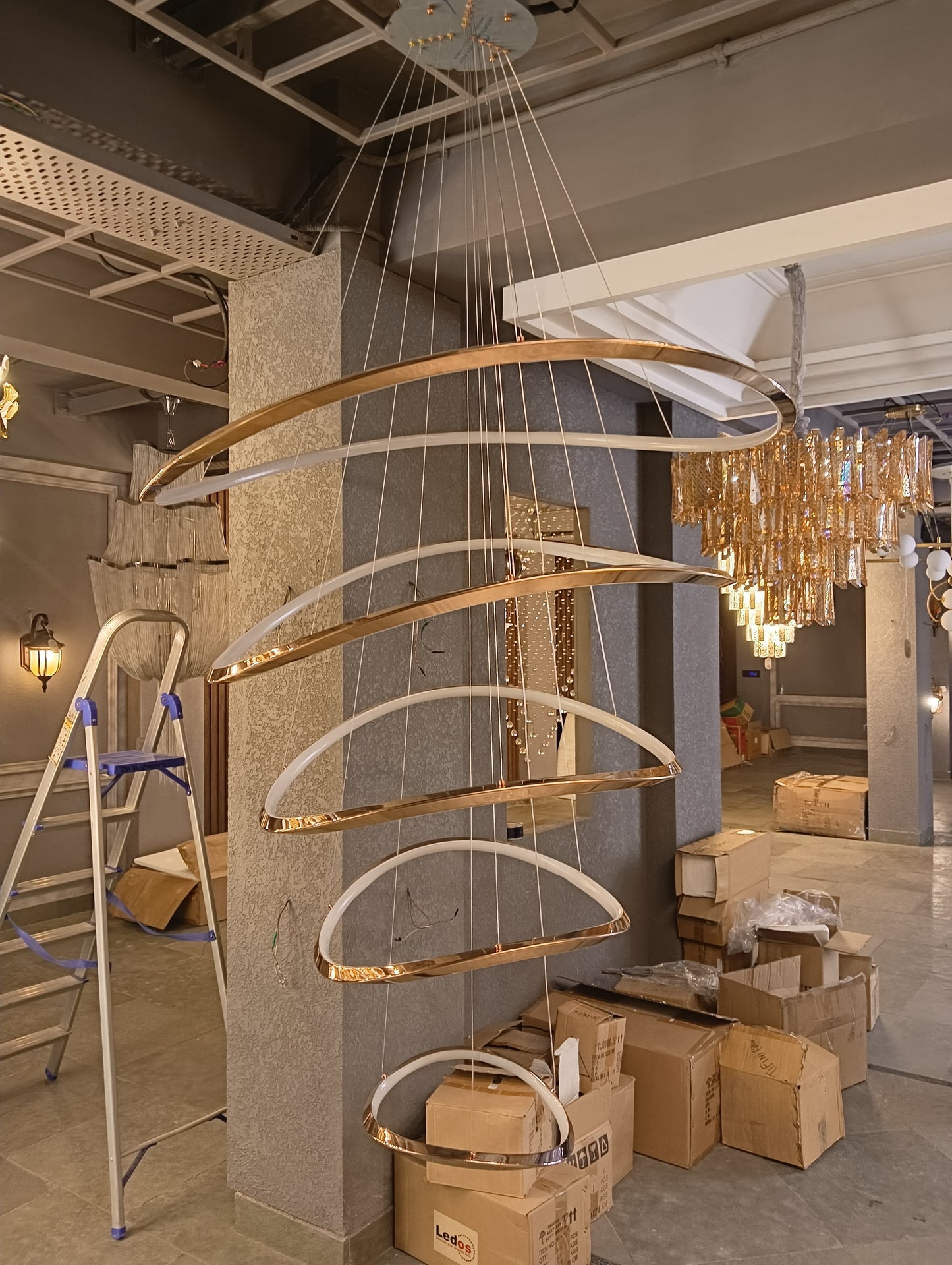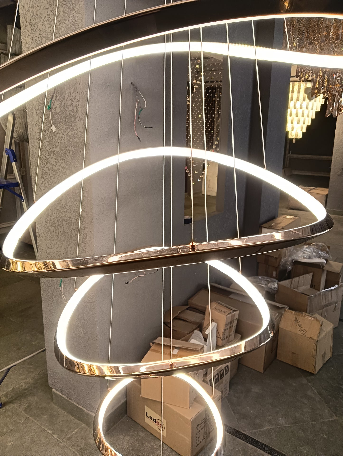 Embodies luxury and modern artistry. Crafted in radiant rose gold, its five cascading rings (Ø1160/970/770/570/370 mm) create a celestial halo effect. Featuring in-built LEDs with 3-in-1 lighting options, it allows seamless transitions between warm, cool, and neutral white tones. Perfect for villas, hotel lobbies, and double height living spaces, Aurora Rose adds a luminous charm that transforms interiors into timeless works of elegance.