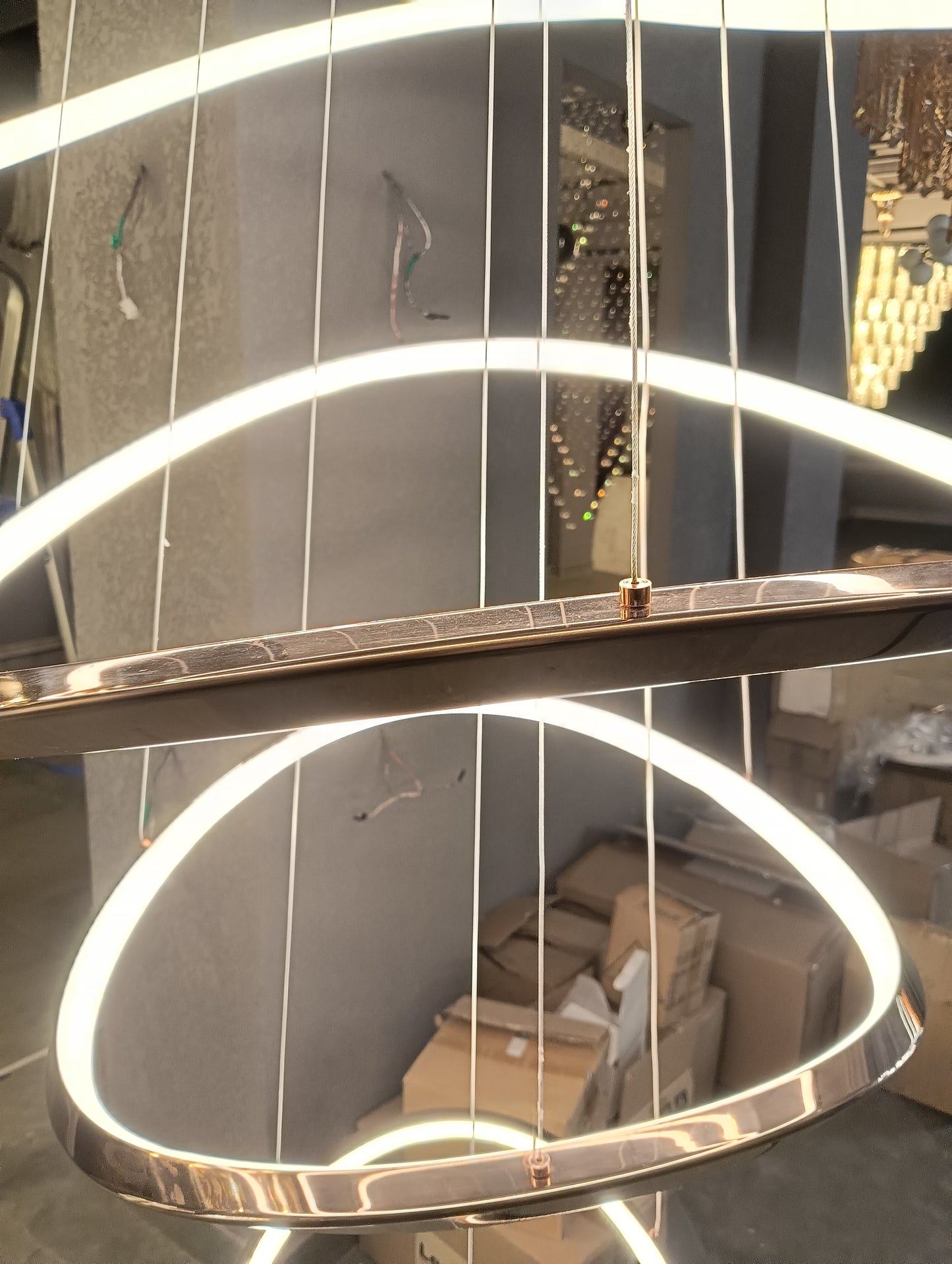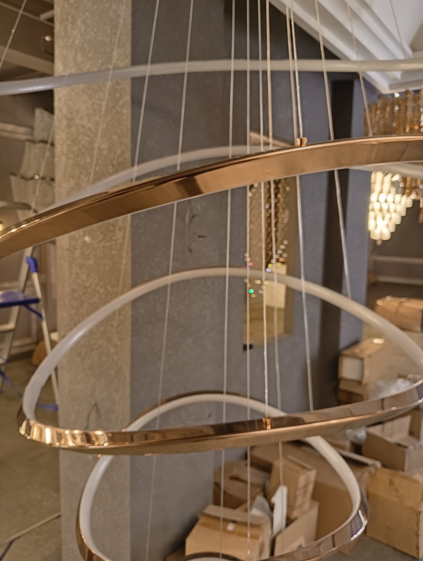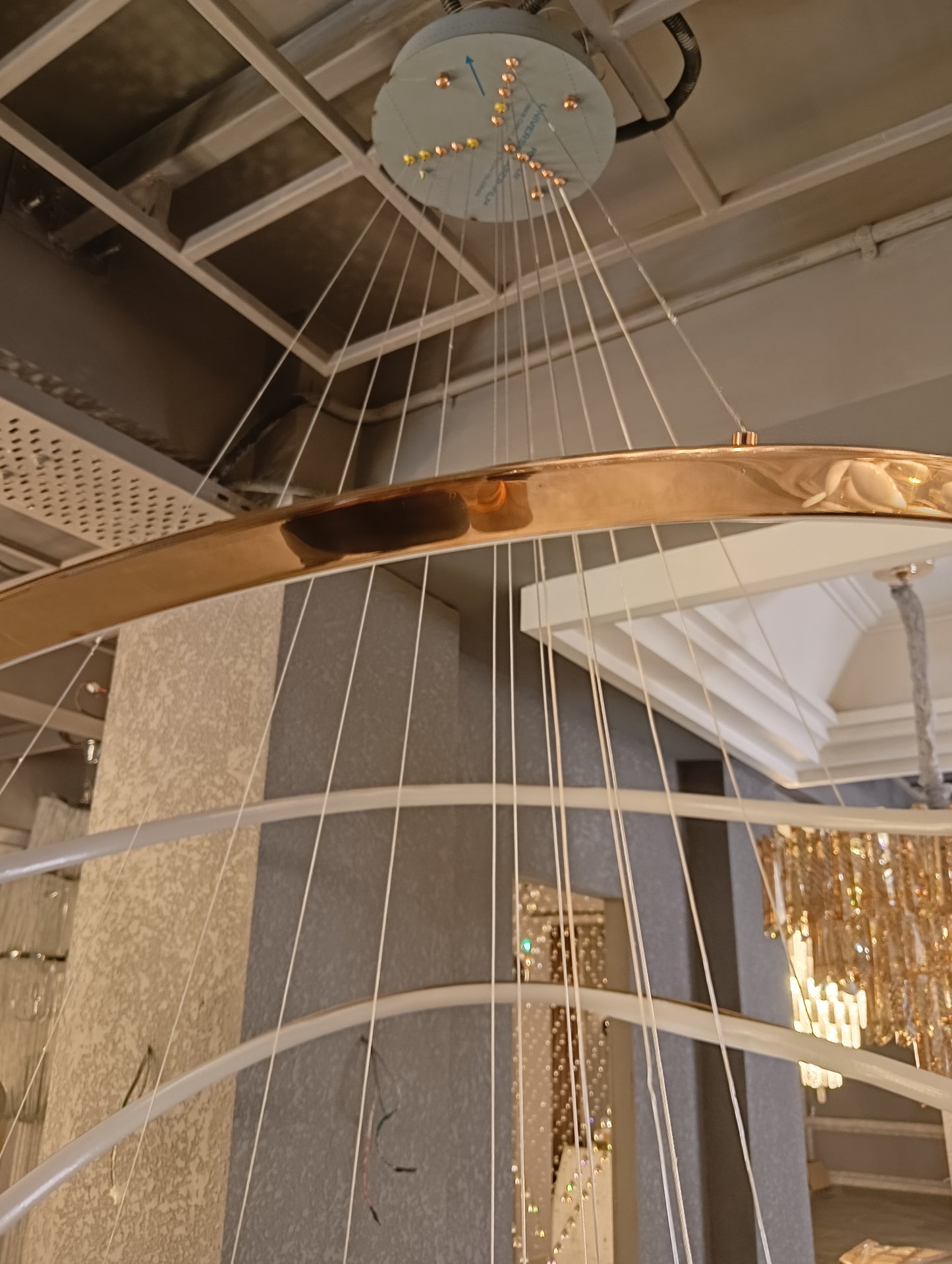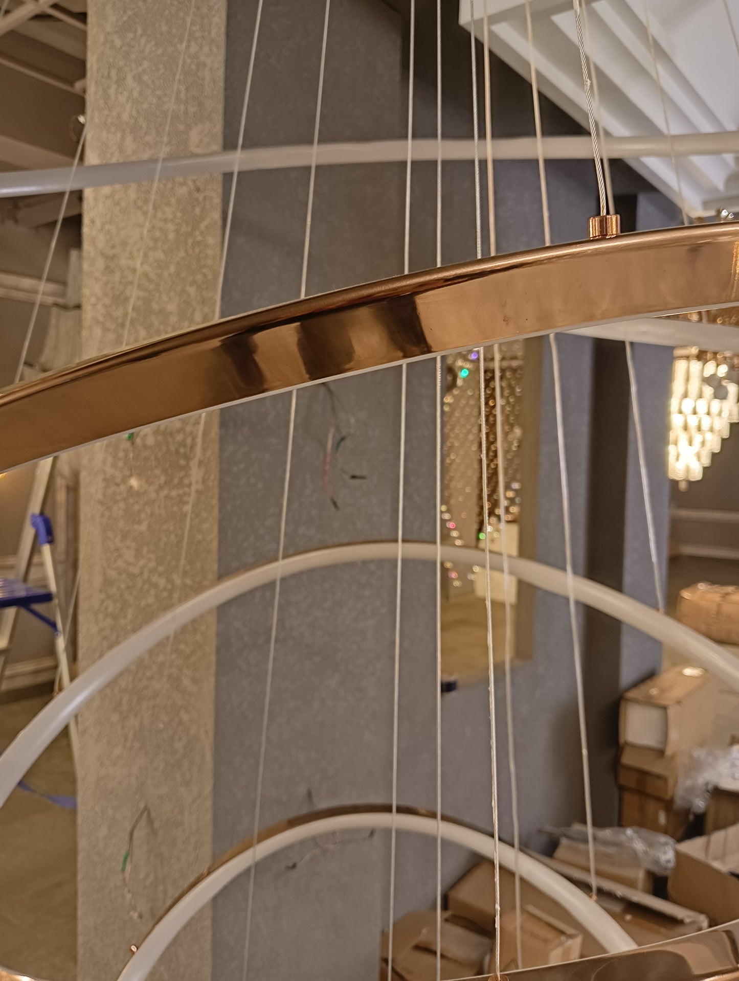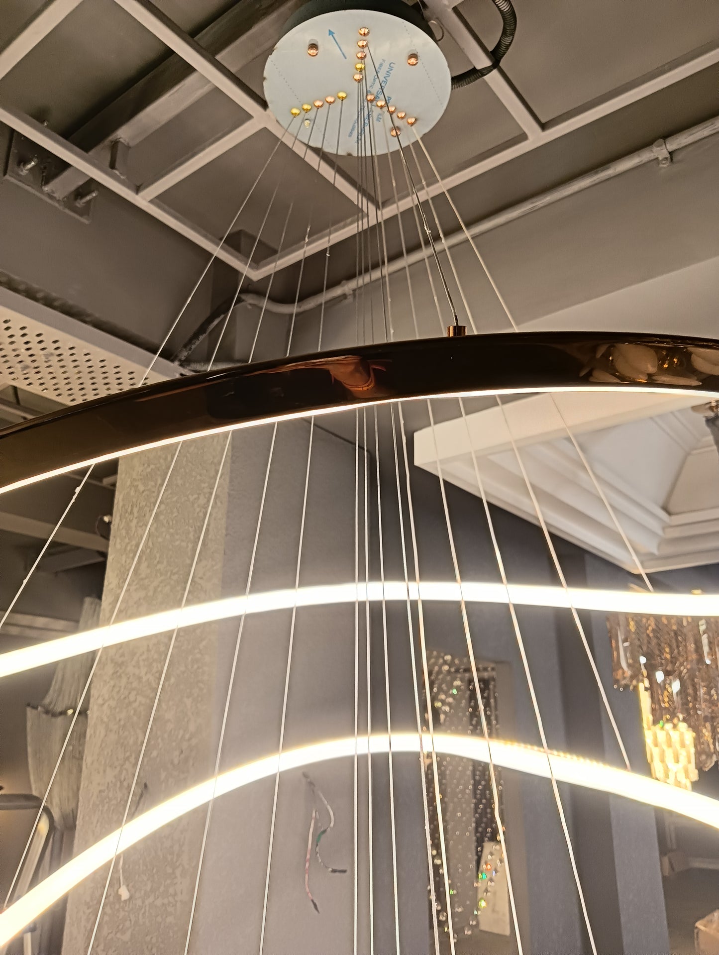 Embodies luxury and modern artistry. Crafted in radiant rose gold, its five cascading rings (Ø1160/970/770/570/370 mm) create a celestial halo effect. Featuring in-built LEDs with 3-in-1 lighting options, it allows seamless transitions between warm, cool, and neutral white tones. Perfect for villas, hotel lobbies, and double height living spaces, Aurora Rose adds a luminous charm that transforms interiors into timeless works of elegance.