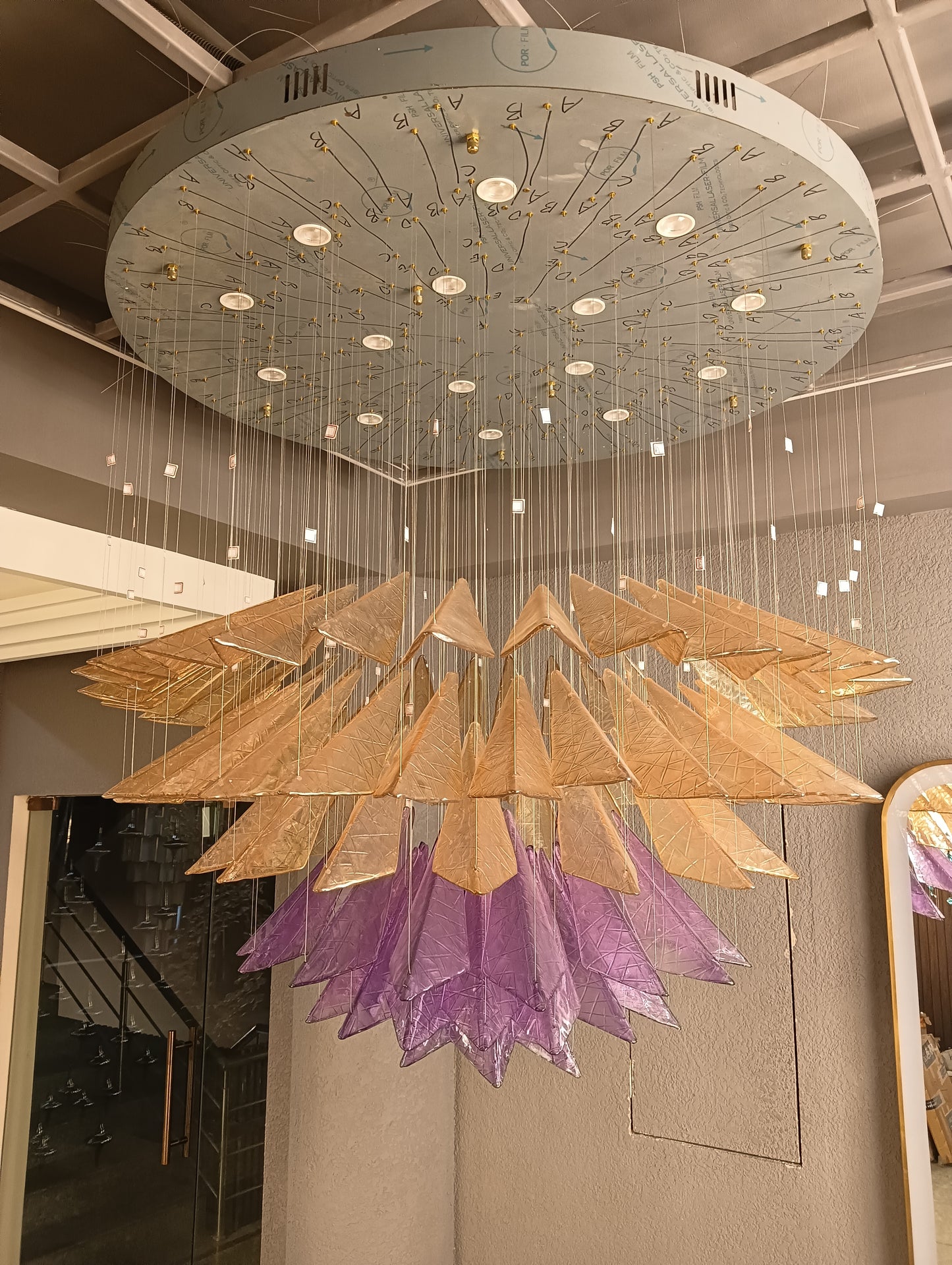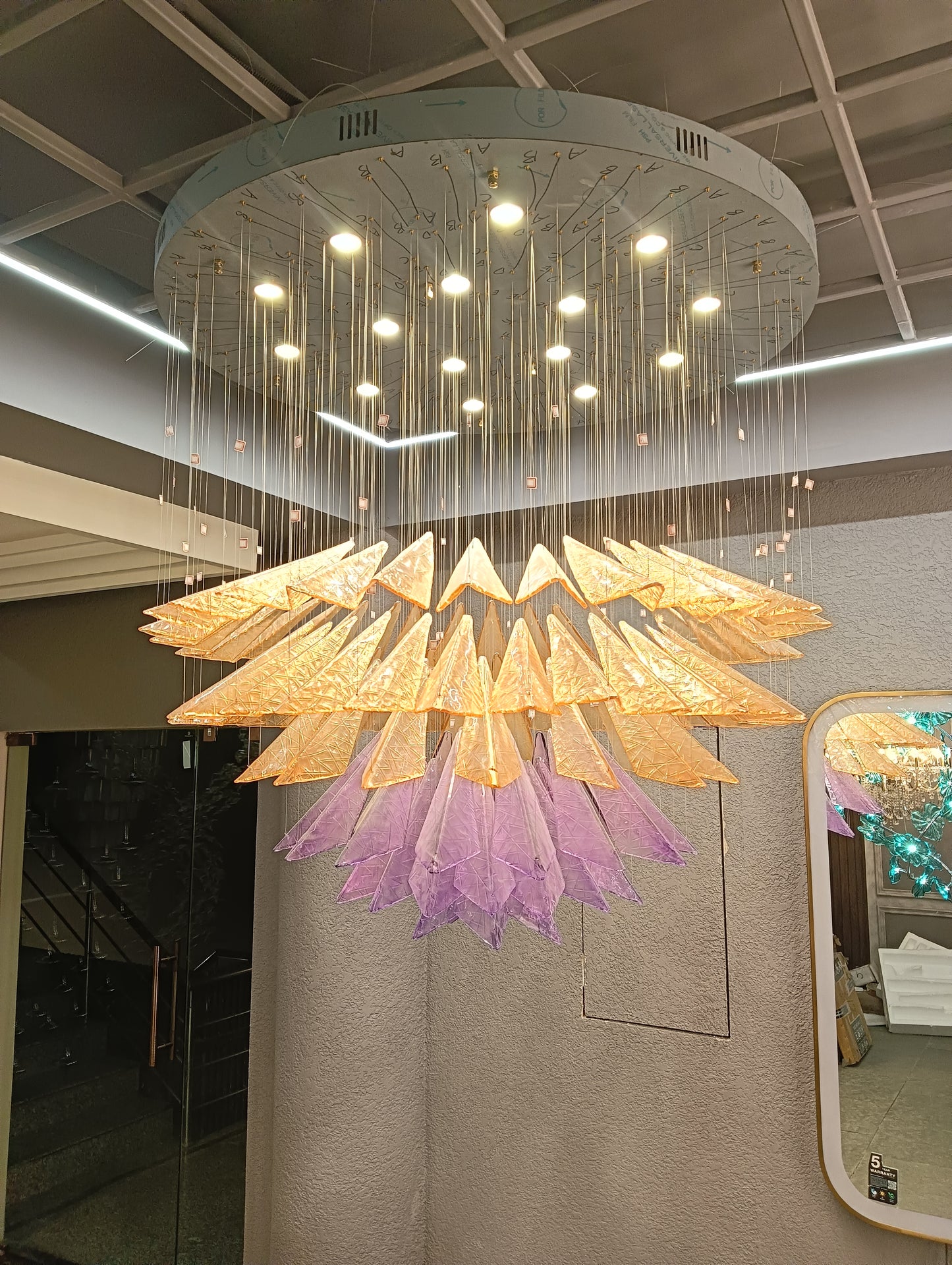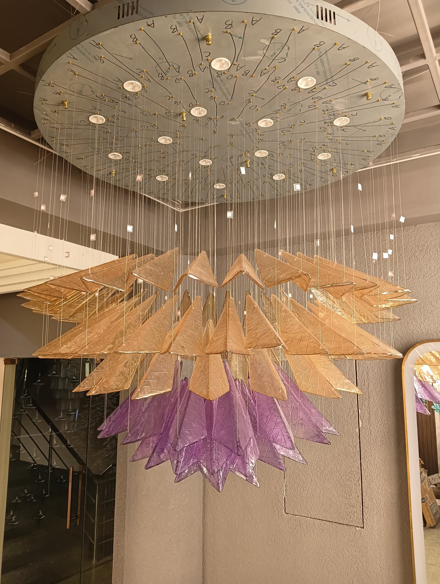 Where light ascends with grace the Opaline Crest by Gloss redefines grandeur. Its gold base and flowing purple-amber glass create a poetic dance of shimmer and shade, perfect for double-height spaces. The warm white glow radiates serenity, turning architecture into art. Every detail speaks of craftsmanship, balance, and timeless splendor a chandelier that doesn’t just illuminate, it inspires.
