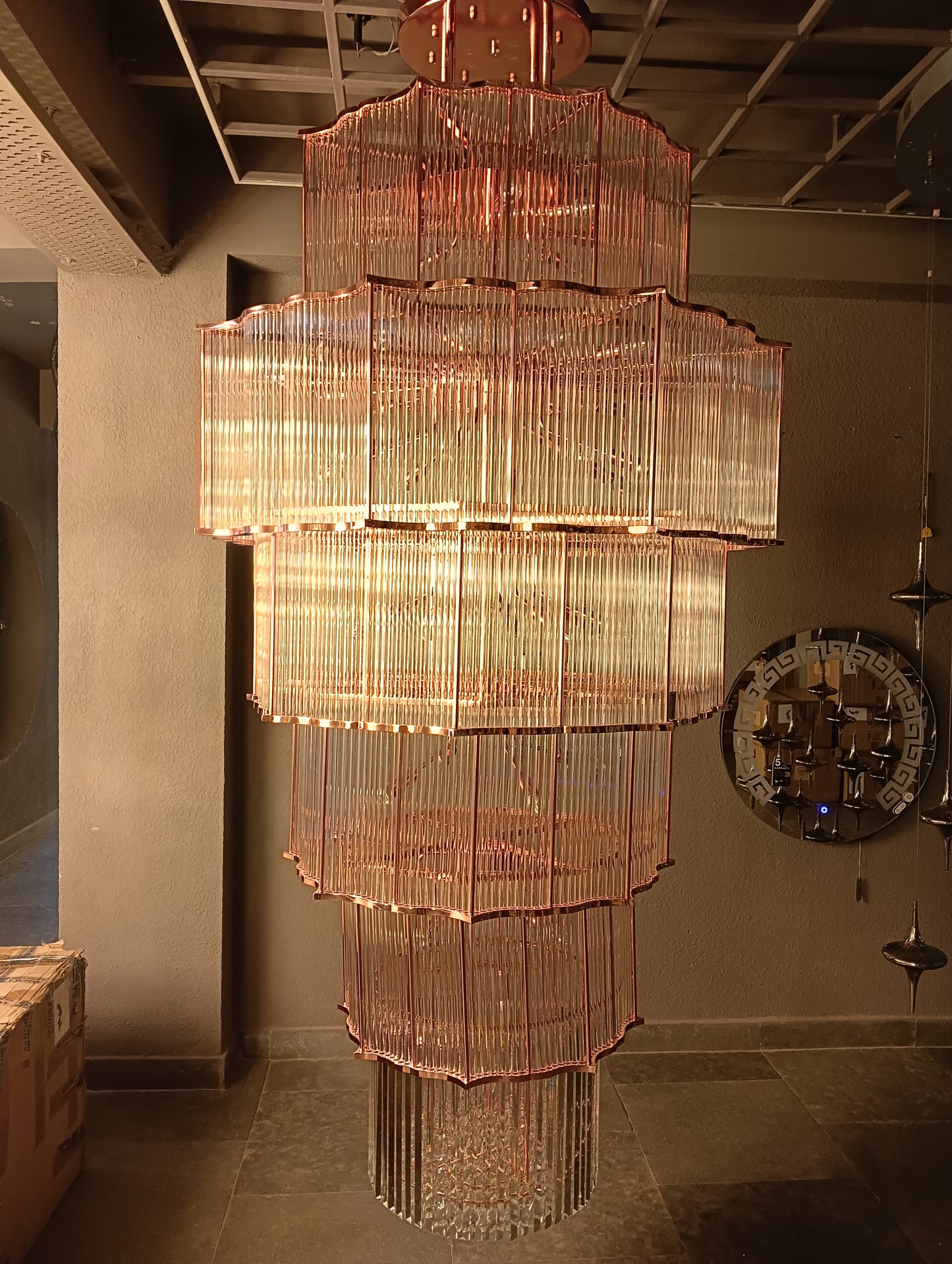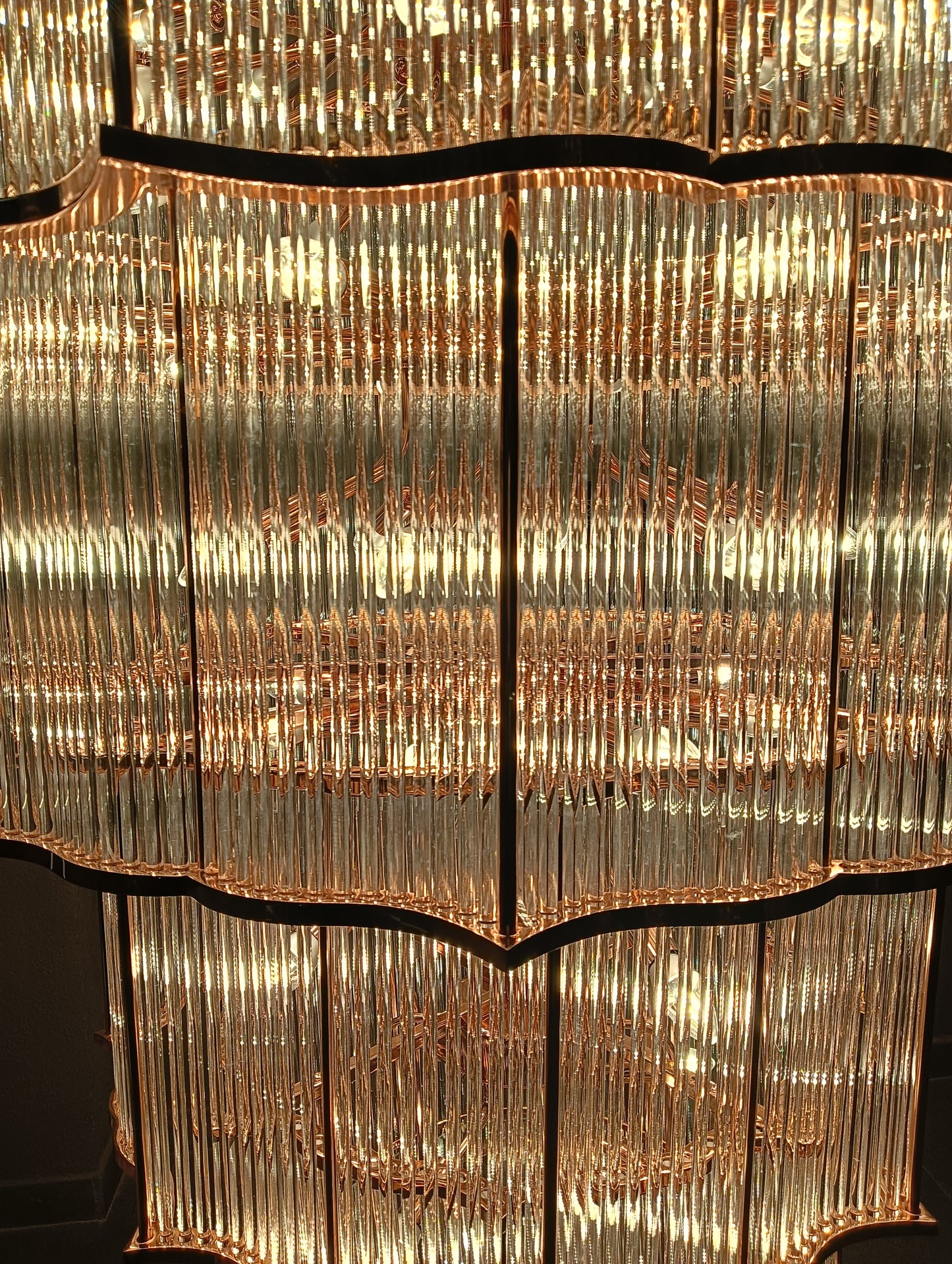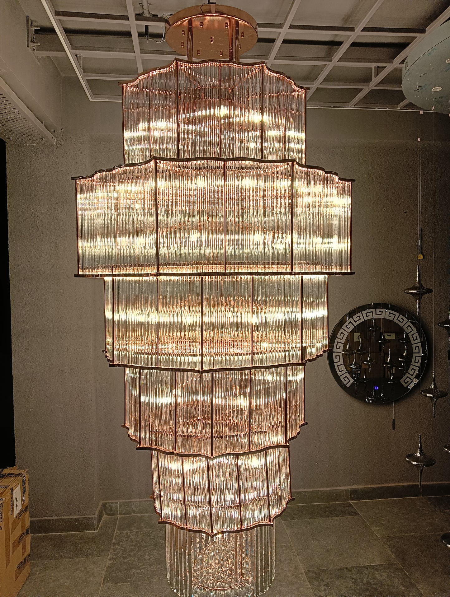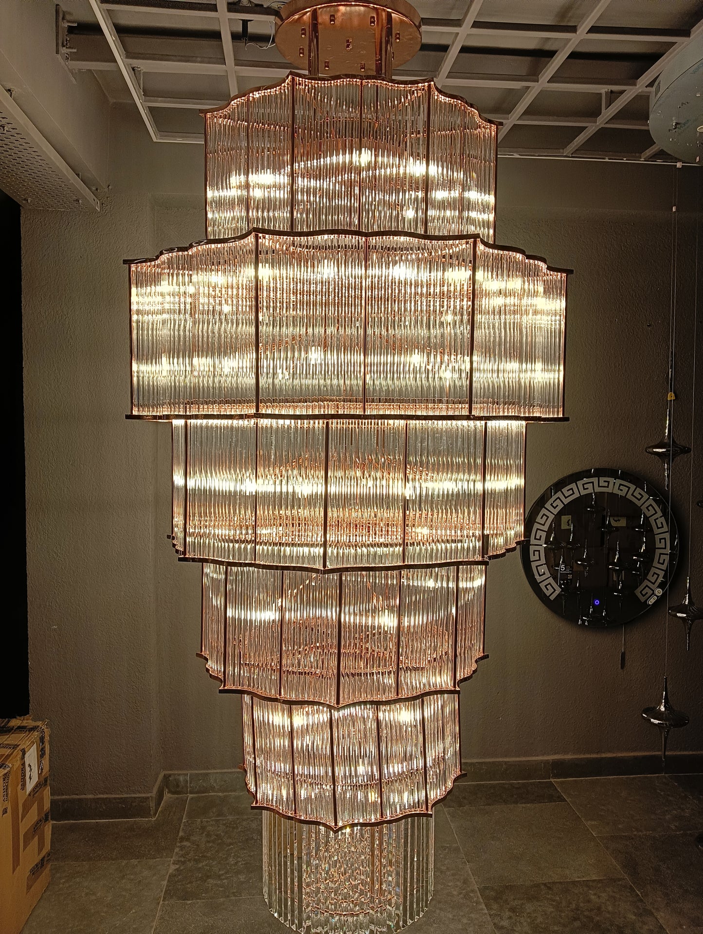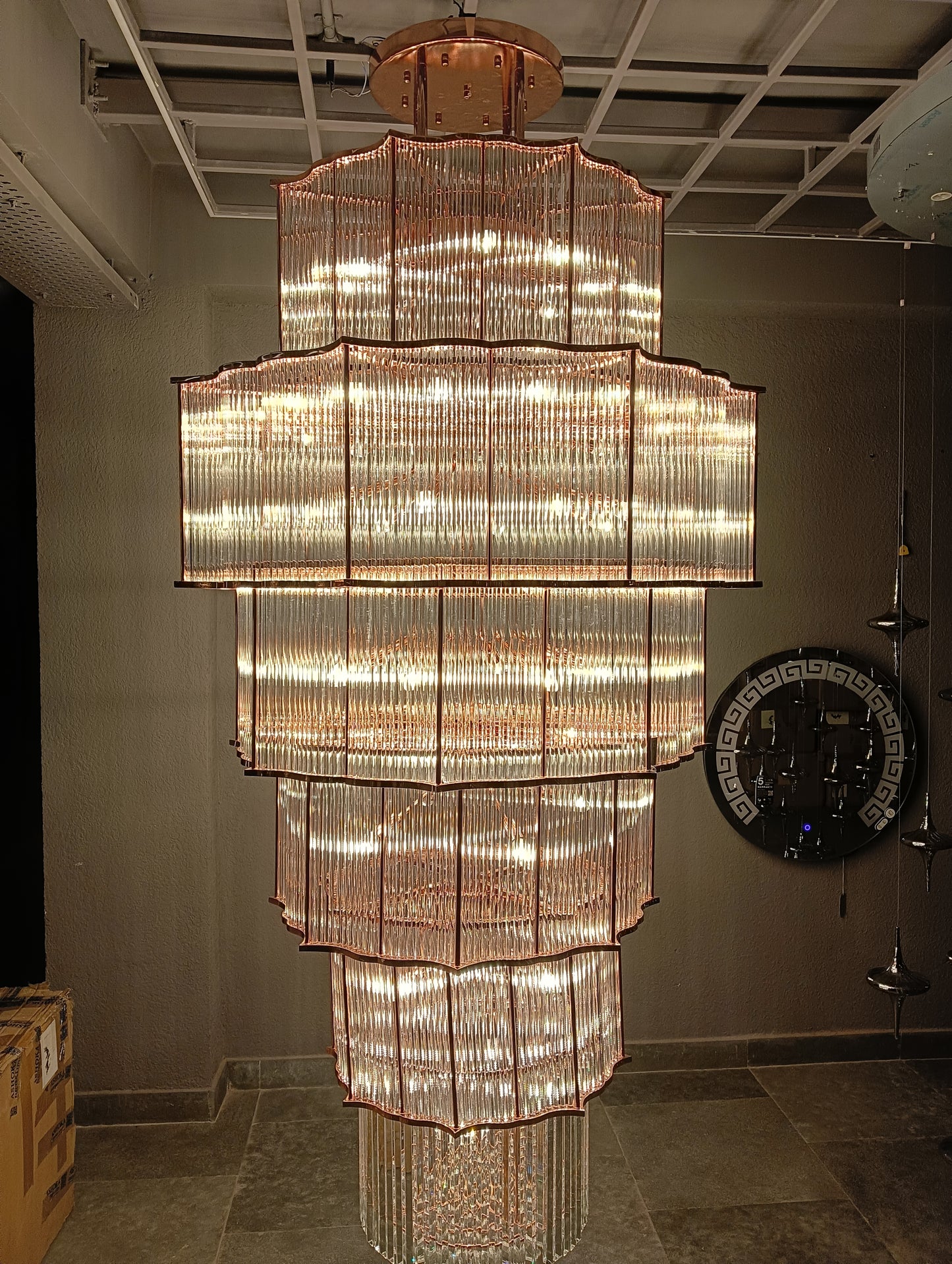 A masterpiece of luxury lighting. Crafted from premium brass and metal with a radiant rose gold finish, it features nine cascading levels of clear glass that shimmer with elegance. Measuring D1200 × H2100 mm, this chandelier is perfect for double-height spaces. Its in-built LED emits a warm white glow, creating a refined atmosphere. An ideal choice for villas, hotels, and luxury residences seeking timeless sophistication.
