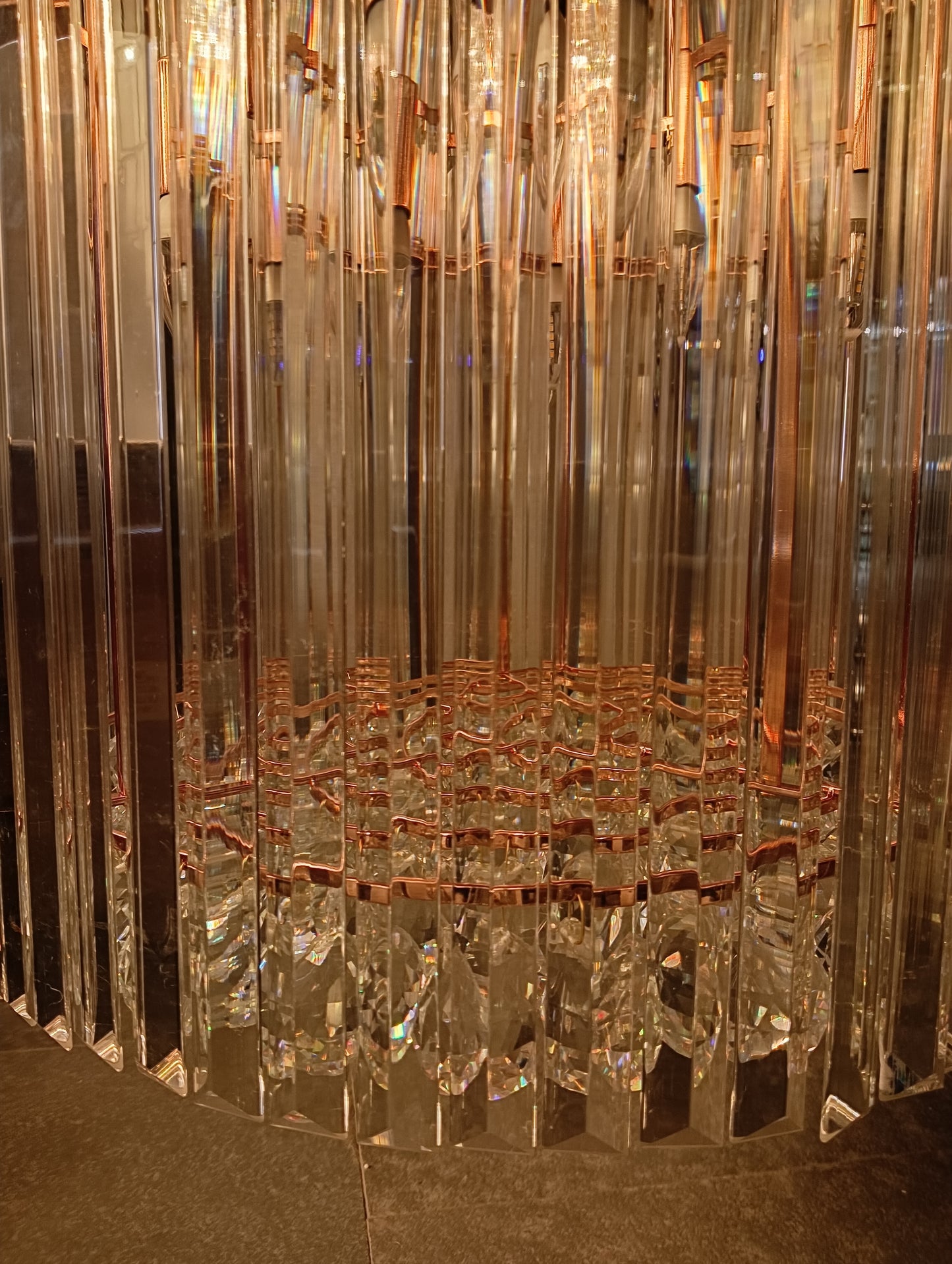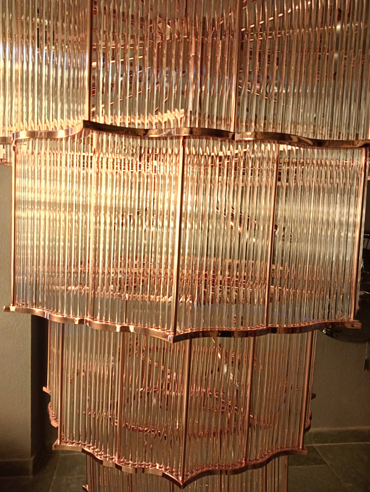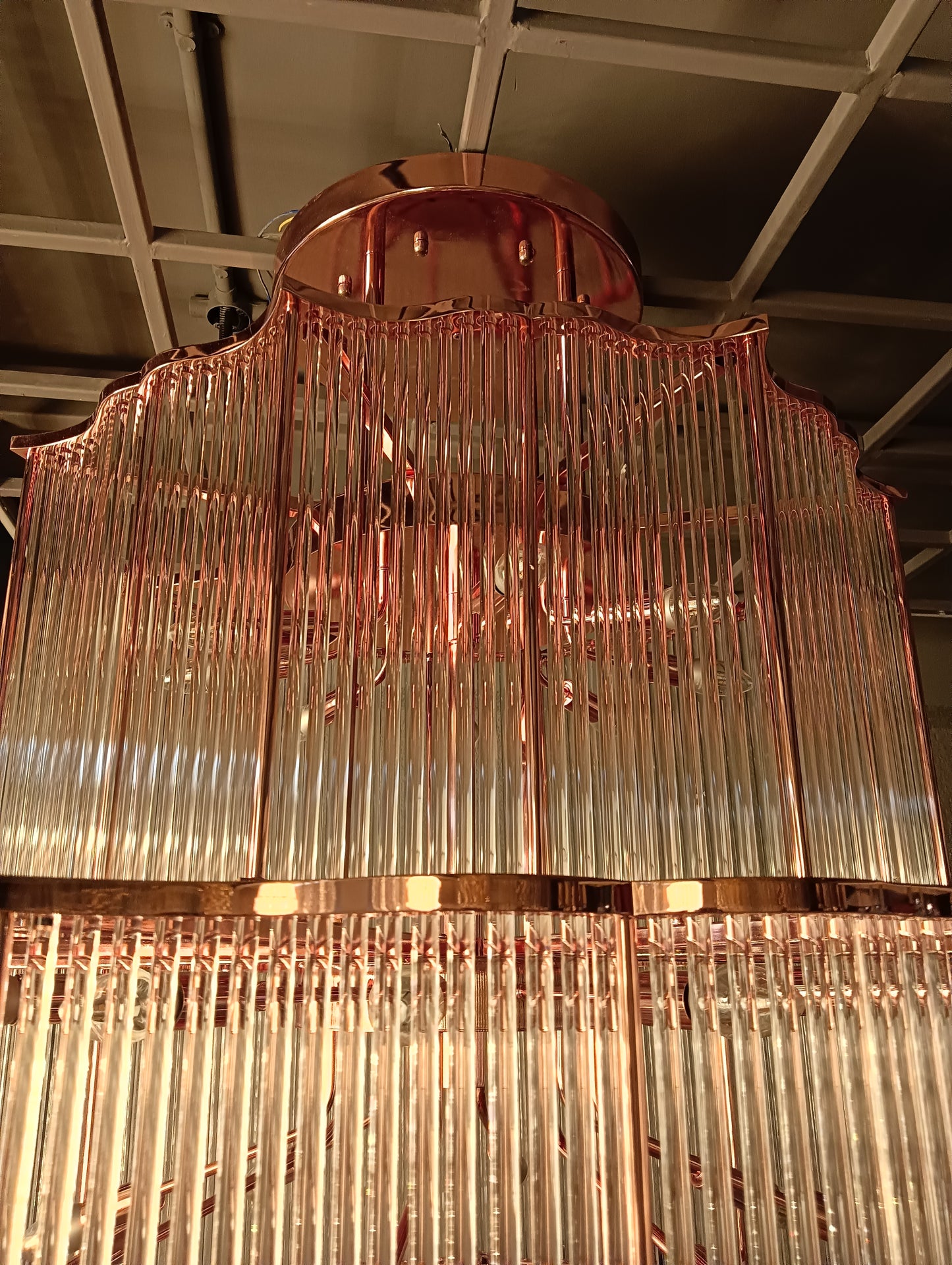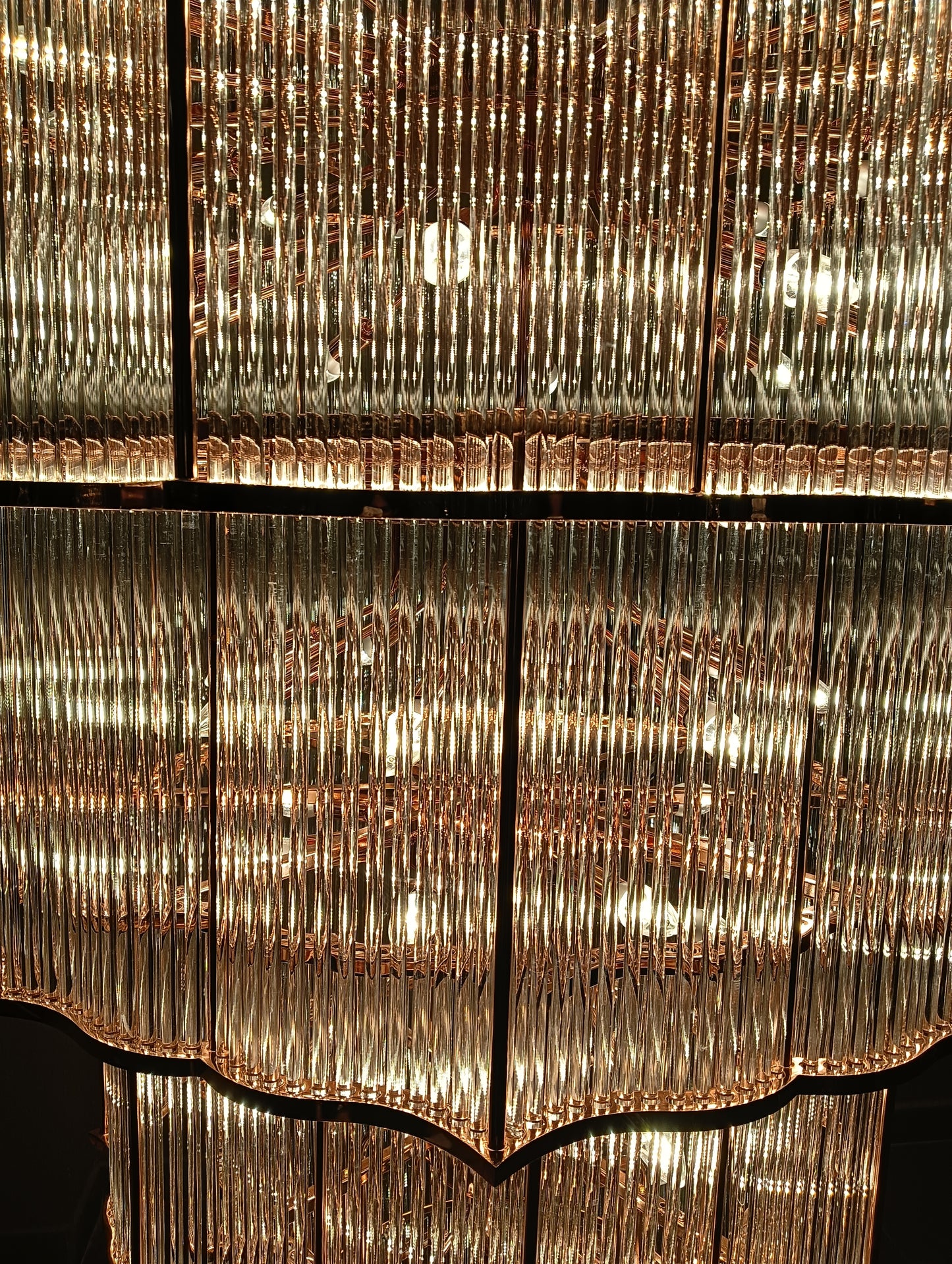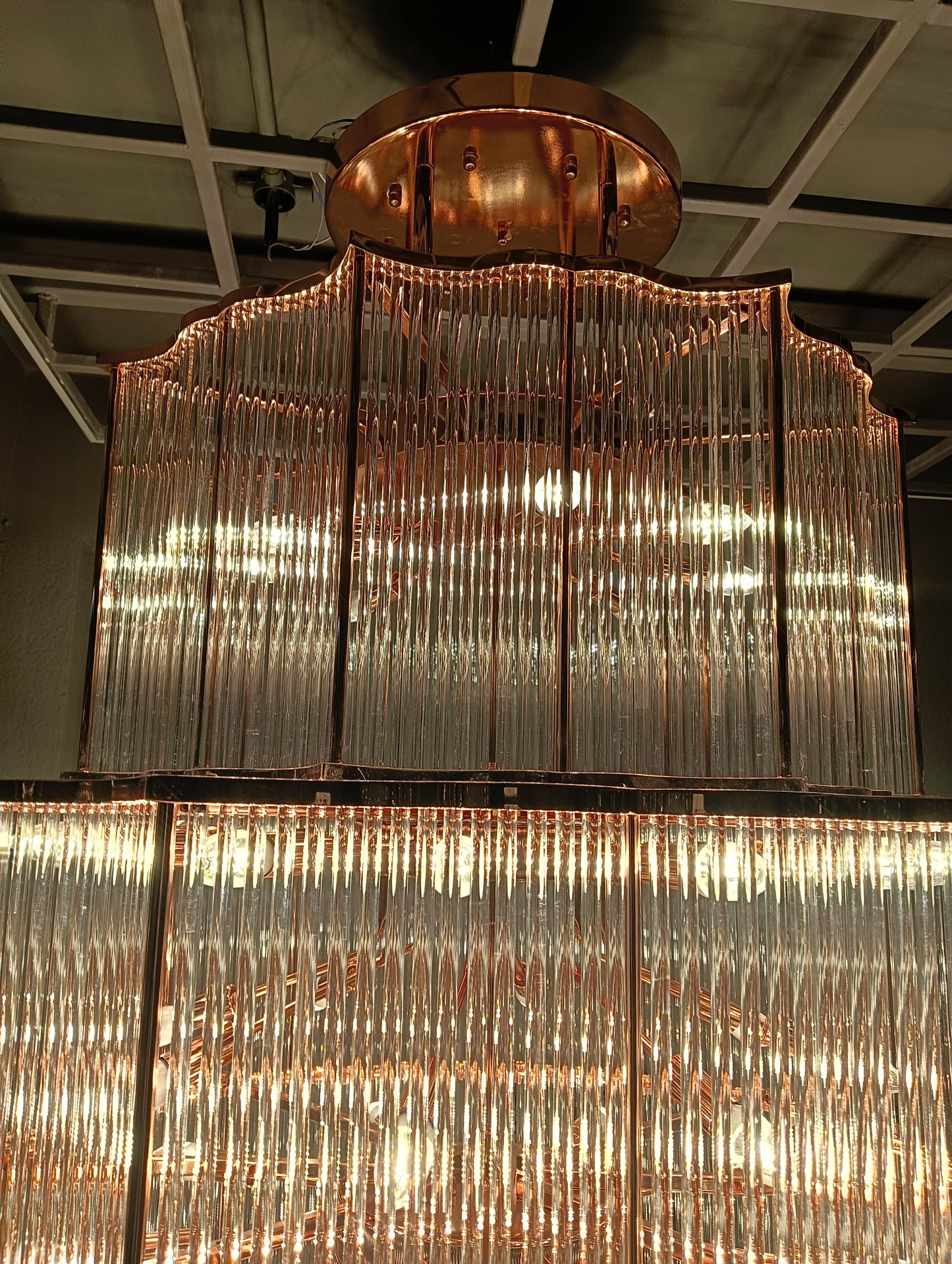 A masterpiece of luxury lighting. Crafted from premium brass and metal with a radiant rose gold finish, it features nine cascading levels of clear glass that shimmer with elegance. Measuring D1200 × H2100 mm, this chandelier is perfect for double-height spaces. Its in-built LED emits a warm white glow, creating a refined atmosphere. An ideal choice for villas, hotels, and luxury residences seeking timeless sophistication.