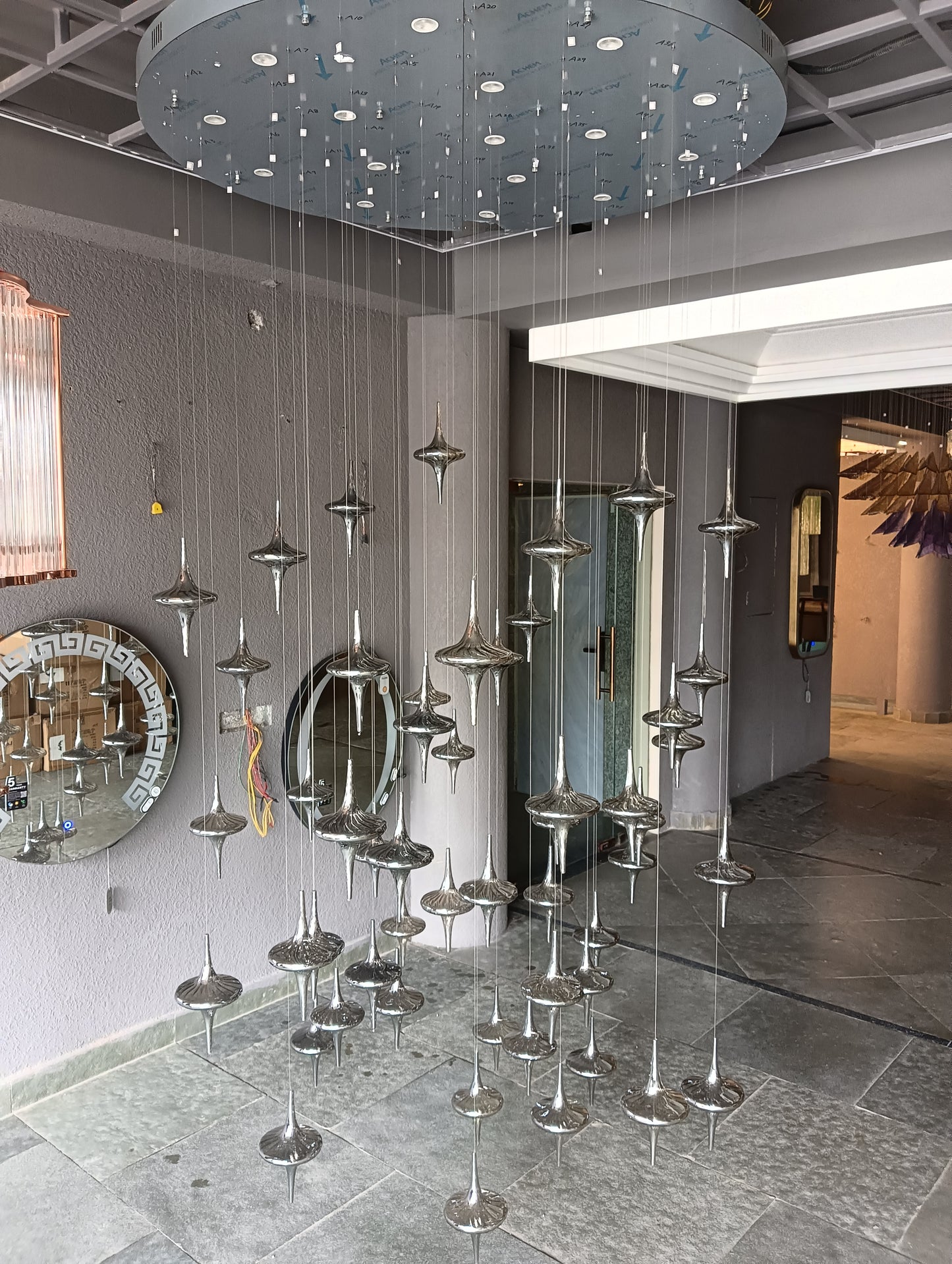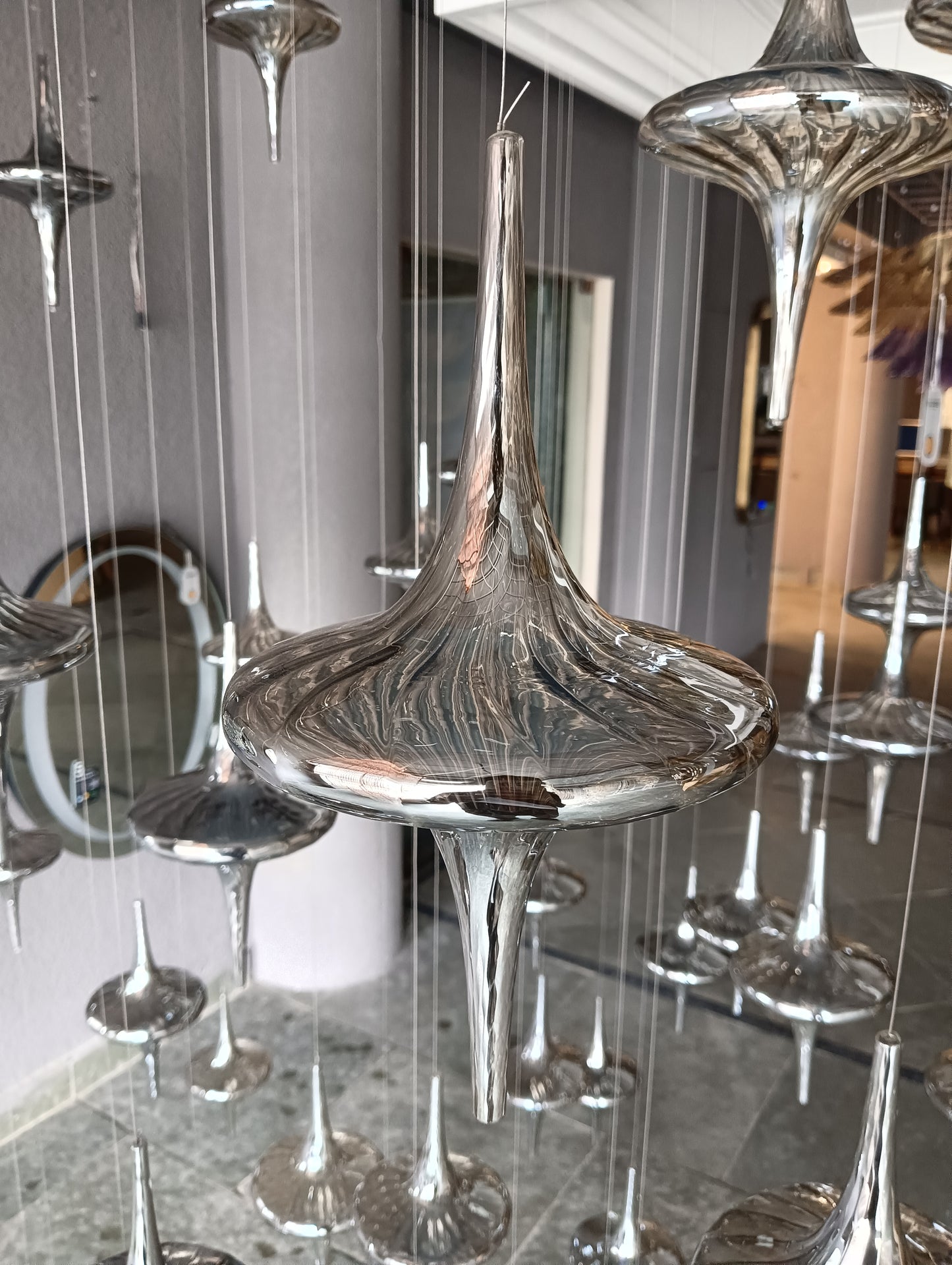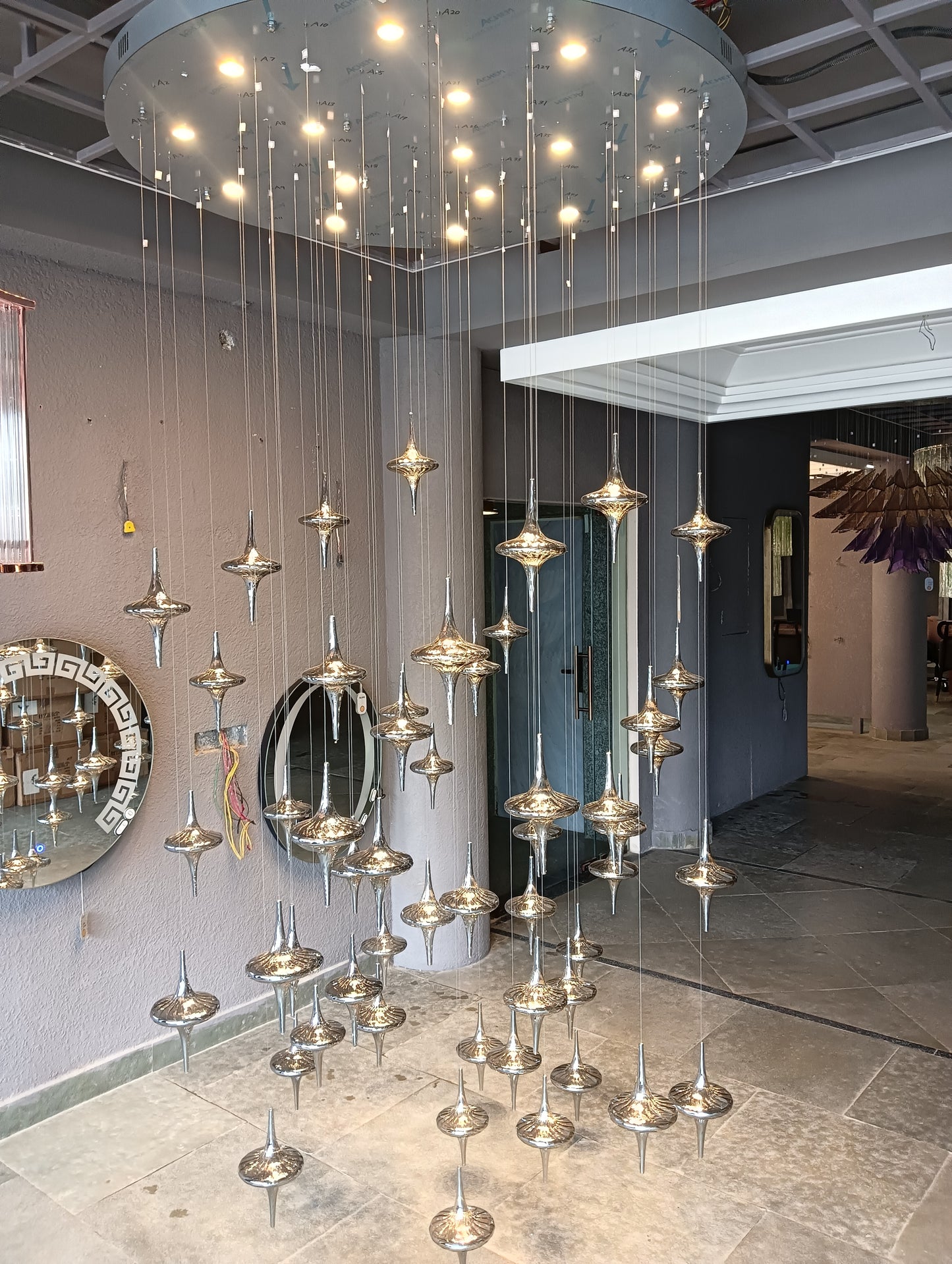 Striking fusion of elegance and modern artistry. Crafted with iron and light smoke glass, its bold smoke finish adds depth and drama to interiors. Measuring D1500 × H2800 mm, it is designed for grand double-height spaces. Featuring GU10 bulb holders, it casts a warm white glow, creating an inviting ambiance. Ideal for villas, hotel lobbies, or luxury residences, Smoky Aura transforms interiors into sophisticated masterpieces.