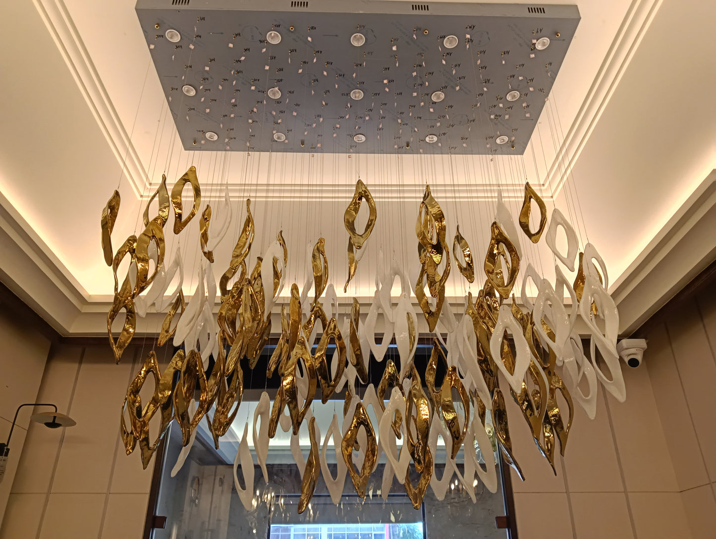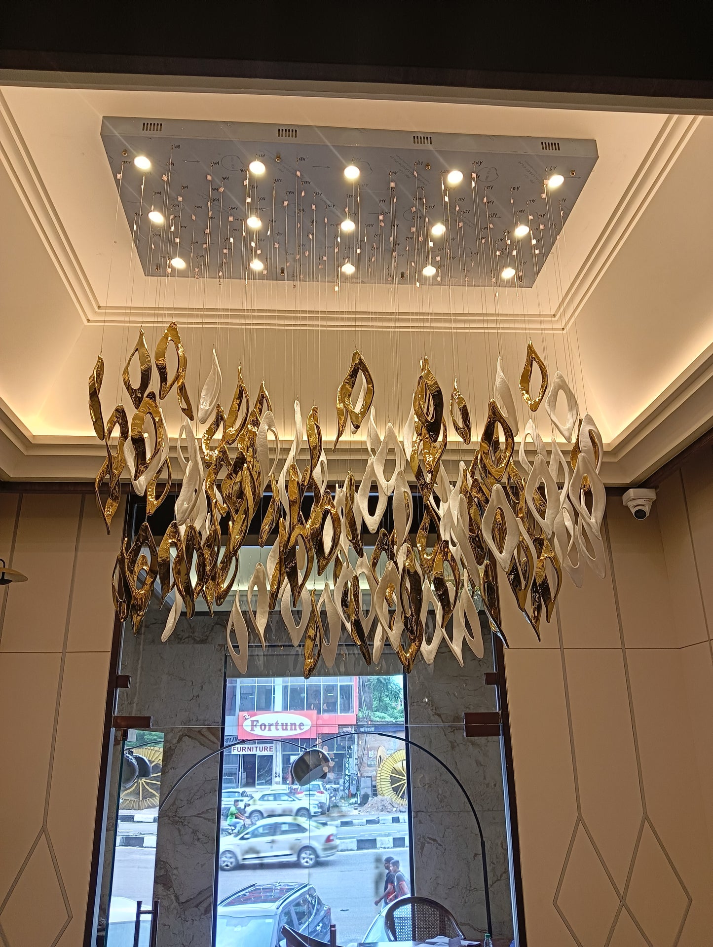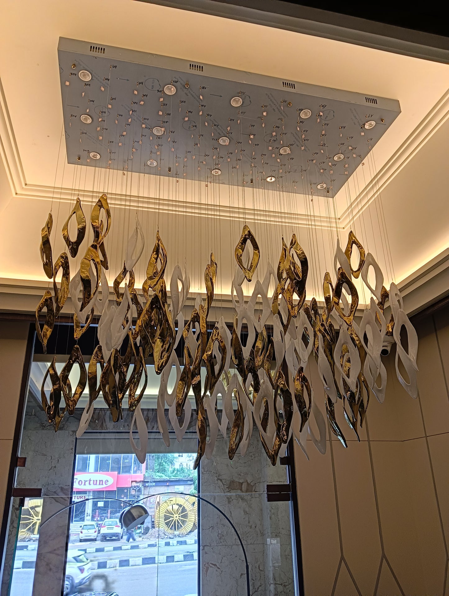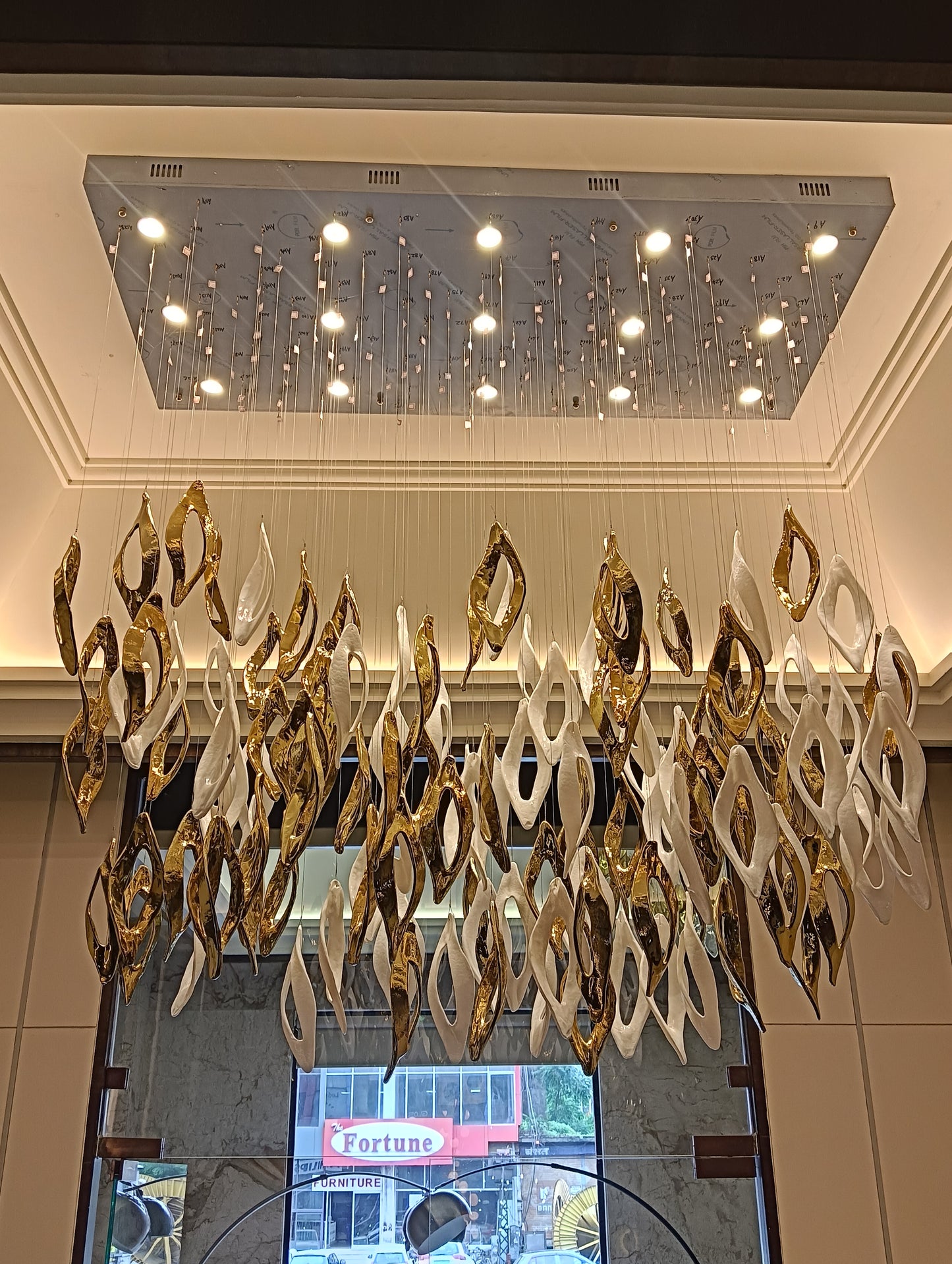 Redefines modern luxury with its elegant gold and white finish. Crafted from premium iron and glass, this masterpiece measures L1500 × W700 × H1500 mm, making it ideal for grand double-height spaces. Featuring GU10 bulb holders, it provides a warm white glow that radiates sophistication and comfort. Perfect for villas, lobbies, or contemporary living areas, Aurora Halo transforms interiors into luminous works of art.