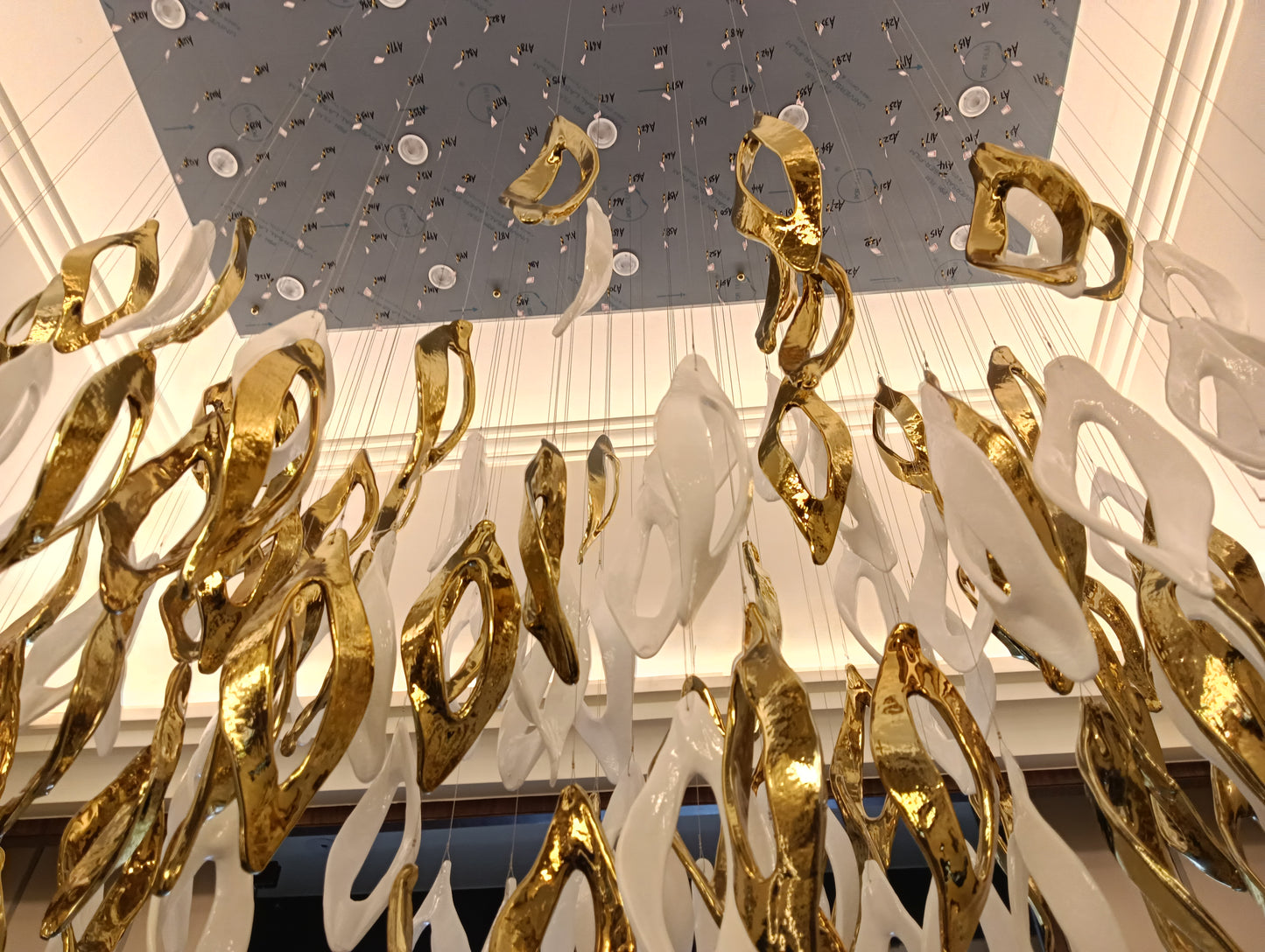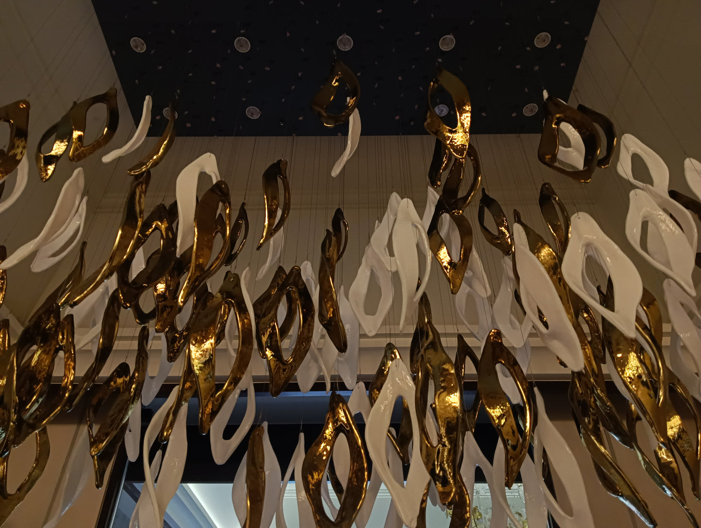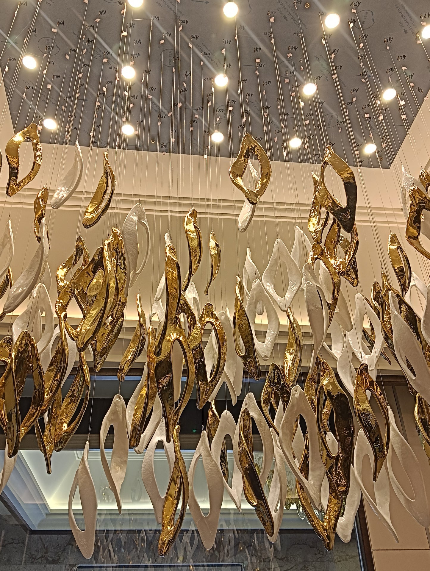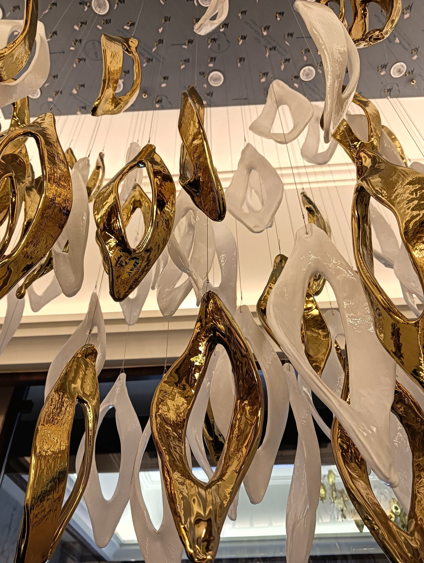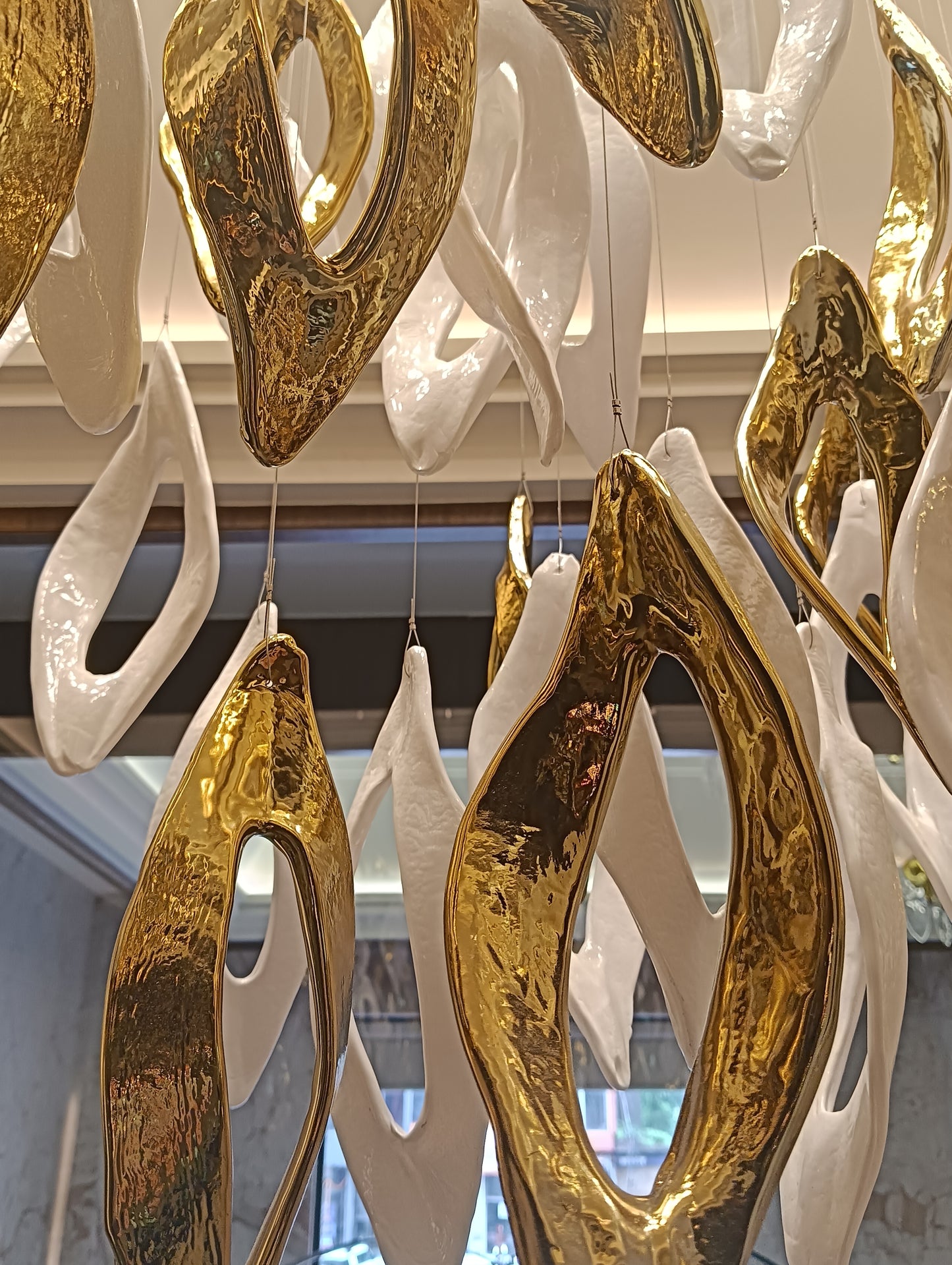 Redefines modern luxury with its elegant gold and white finish. Crafted from premium iron and glass, this masterpiece measures L1500 × W700 × H1500 mm, making it ideal for grand double-height spaces. Featuring GU10 bulb holders, it provides a warm white glow that radiates sophistication and comfort. Perfect for villas, lobbies, or contemporary living areas, Aurora Halo transforms interiors into luminous works of art.