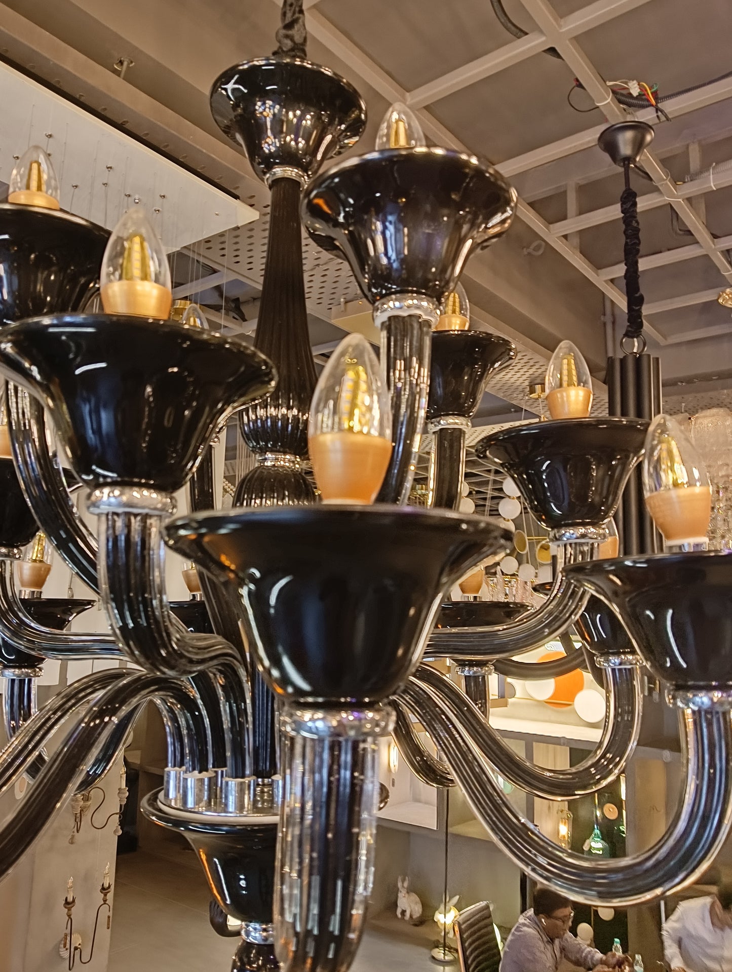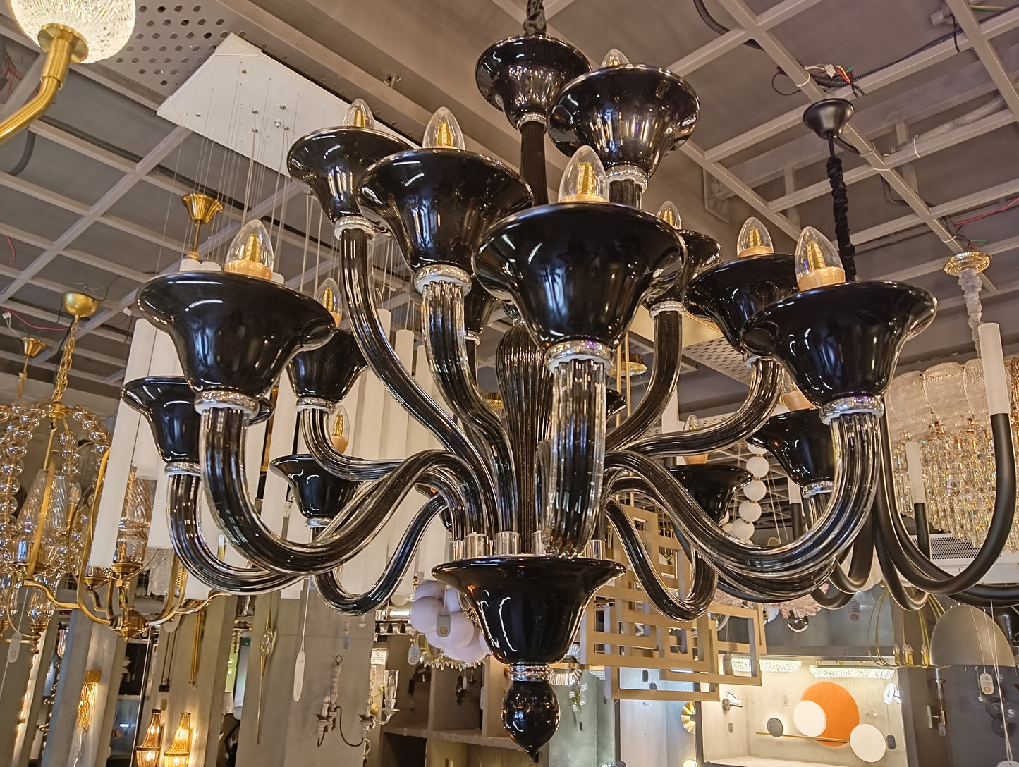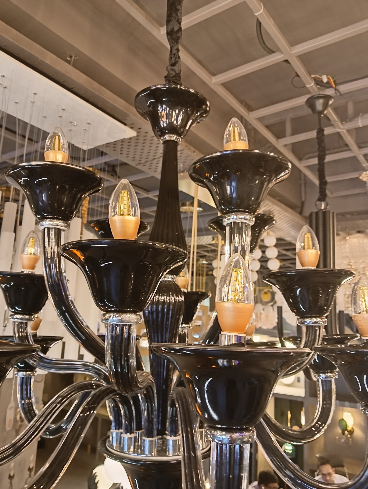 It is a stunning blend of modern elegance and timeless charm. Crafted in rich black glass with a bold silhouette, this chandelier measures D800 × H600 mm and features multiple layers of lights for a grand presence. Designed with E14 bulb holders, it supports warm white or white bulbs to suit your mood. Perfect for dining areas, living rooms, or grand halls, it creates a dramatic statement in any space.