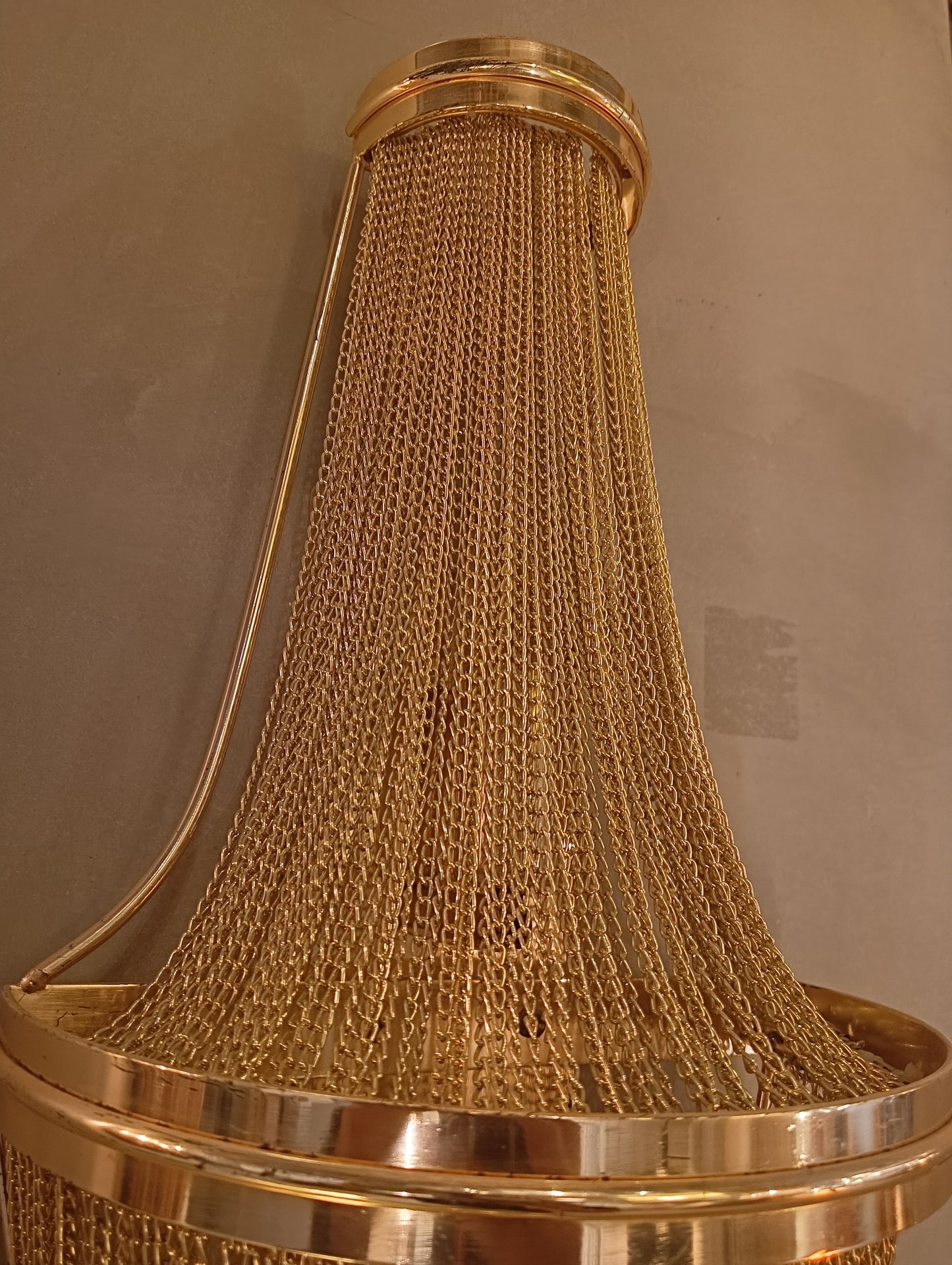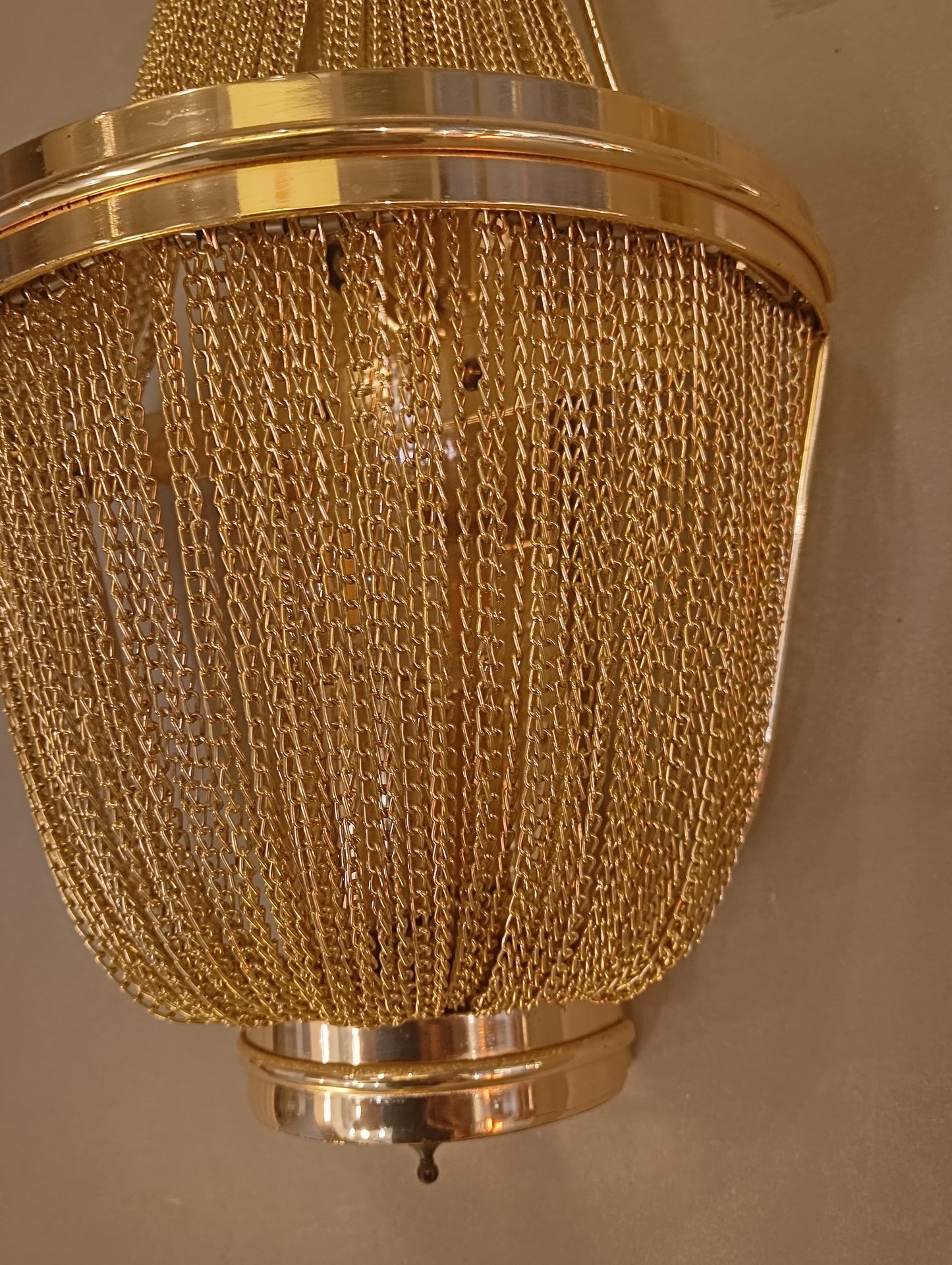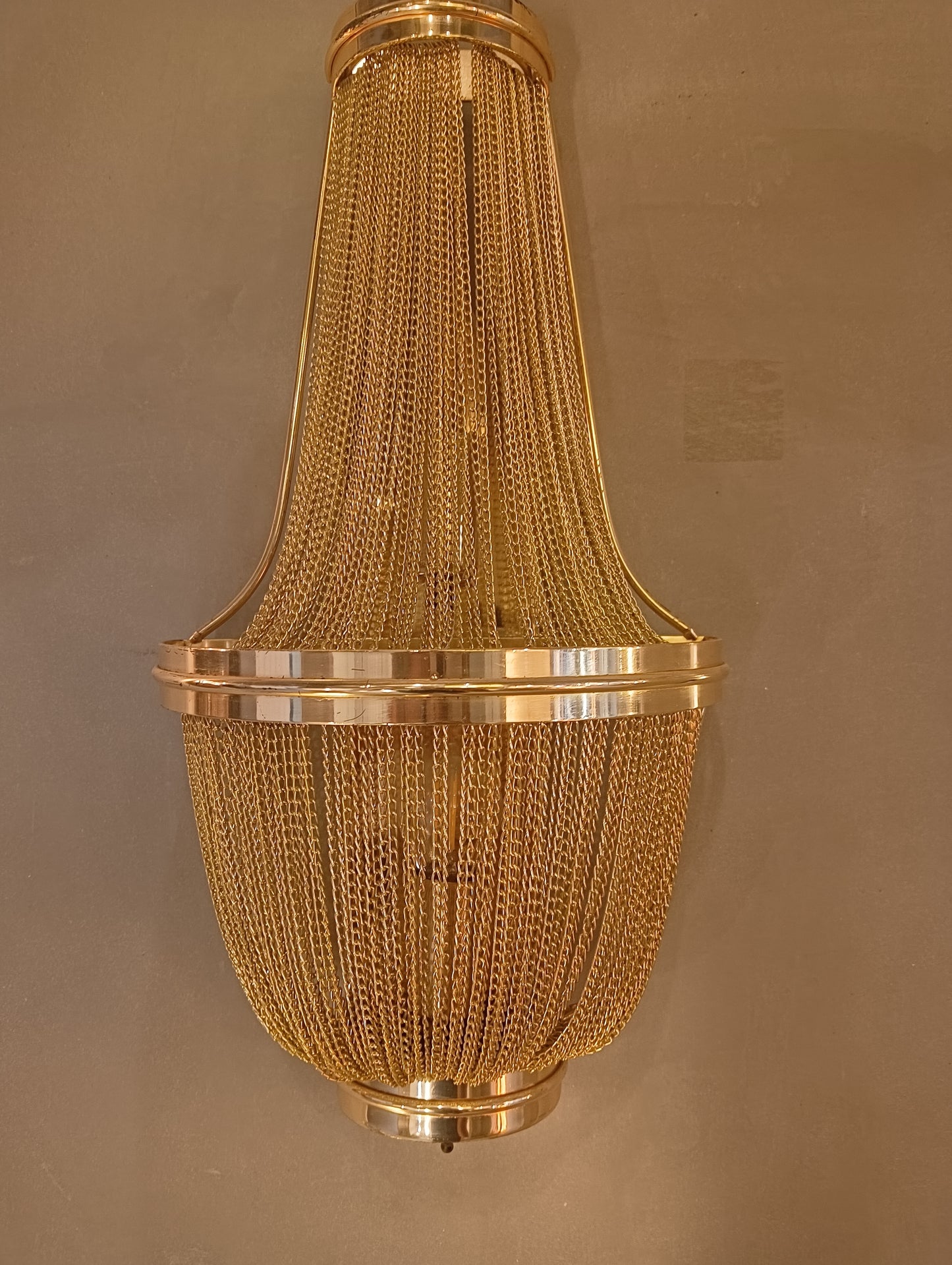 It is a striking blend of elegance and artistry. Featuring a luxurious golden metal frame with a graceful design, it mimics the beauty of a mini chandelier mounted on your wall. Its detailed structure reflects sophistication while the E14 bulb holder lets you choose between warm white or white light. Measuring H482 x W254 mm, it is perfect for enhancing bedrooms, hallways, or living rooms with a regal glow.