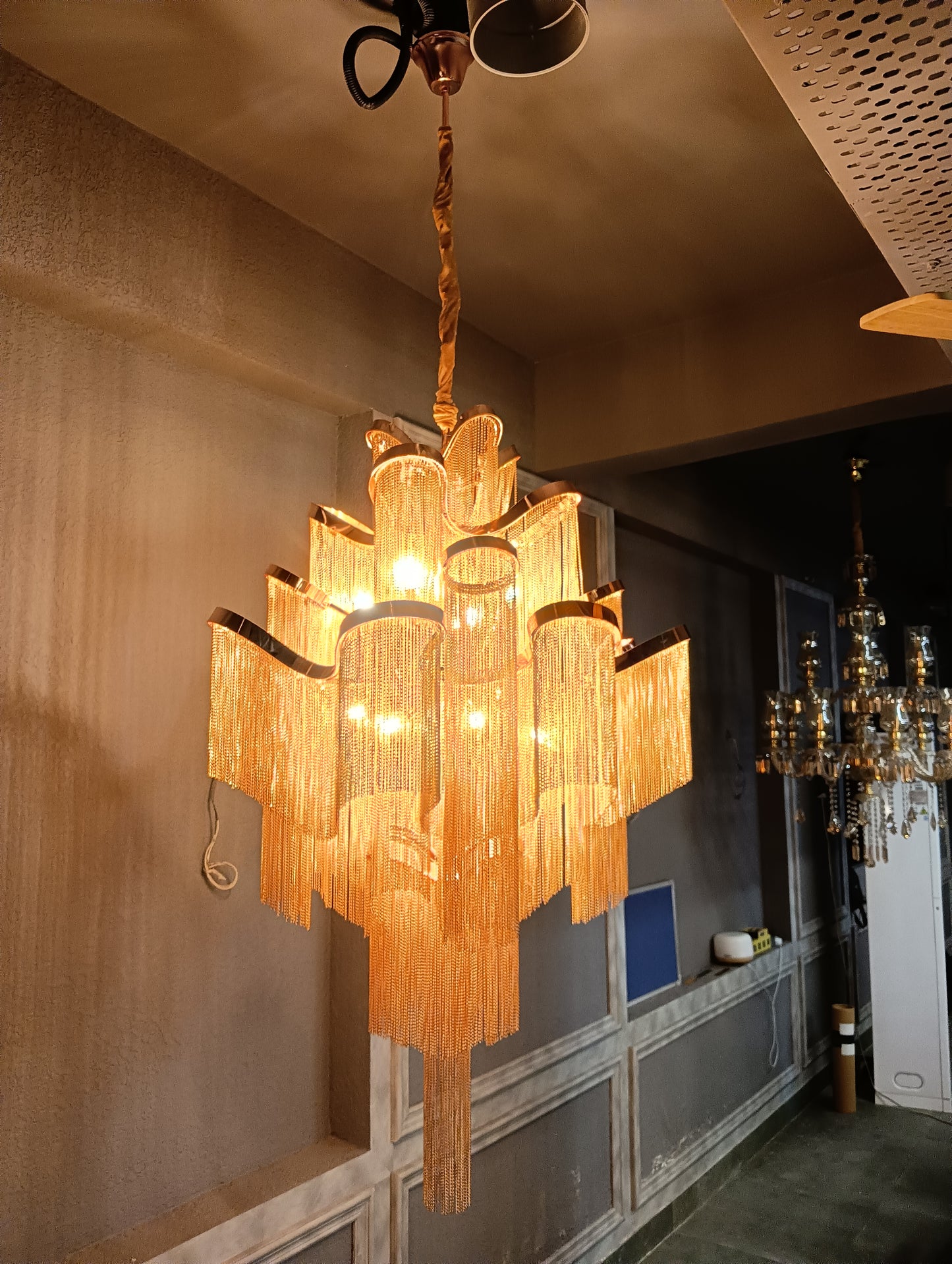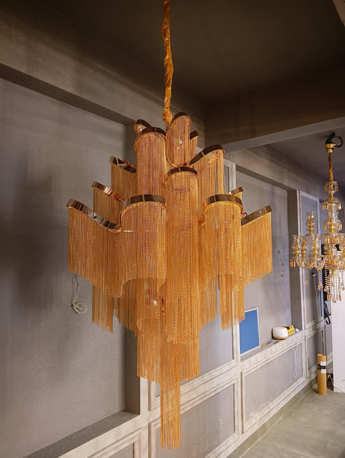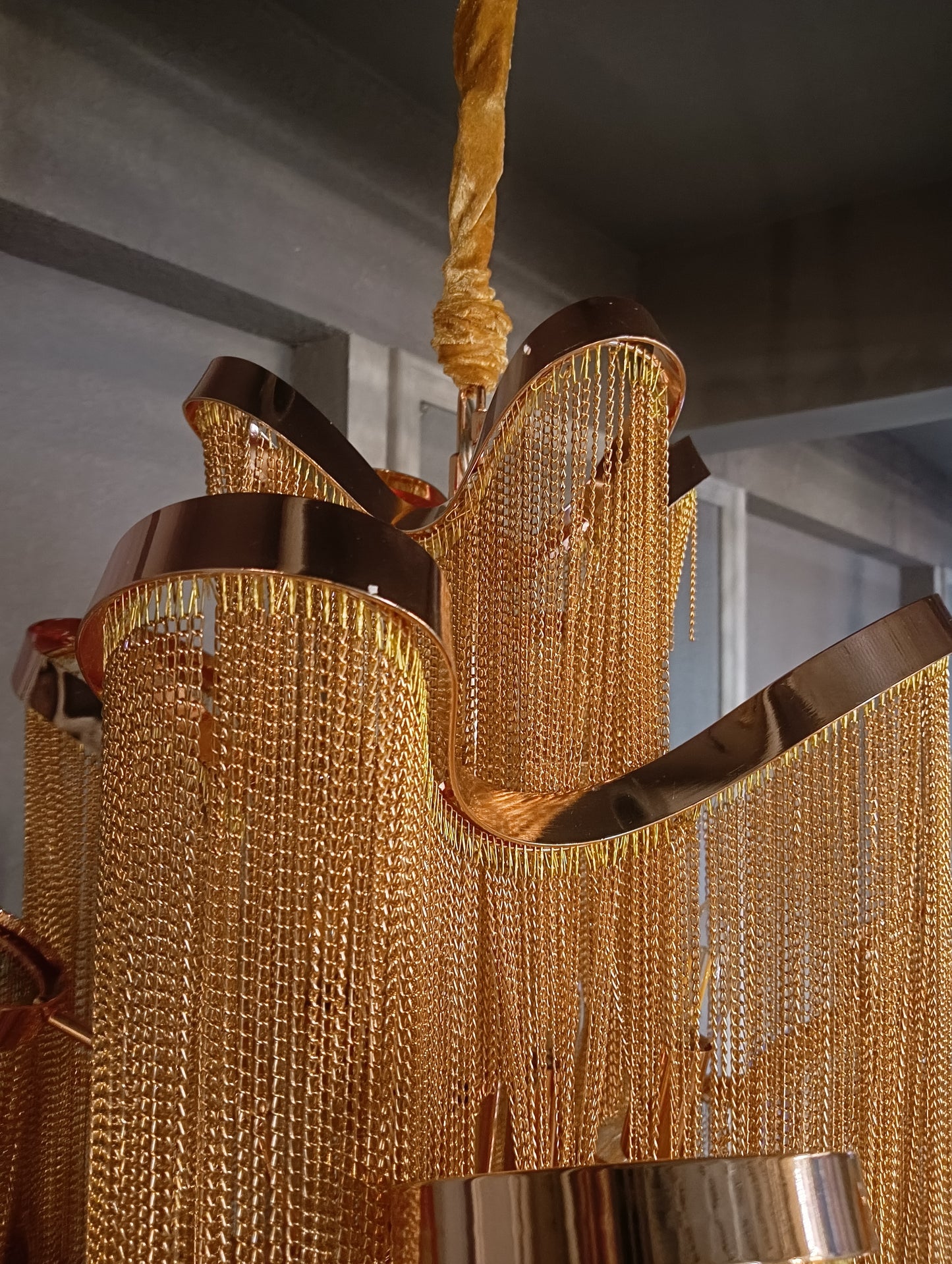 It is designed for luxury double-height spaces. Crafted from durable metal with a golden finish, it measures D800 × H1270 mm and supports E14 bulbs (purchased separately). Its tiered structure and warm white illumination create a regal centerpiece for villas, banquet halls, and hotel lobbies. Combining grandeur with elegance, the Imperial Crown enhances interiors with golden brilliance and timeless sophistication.