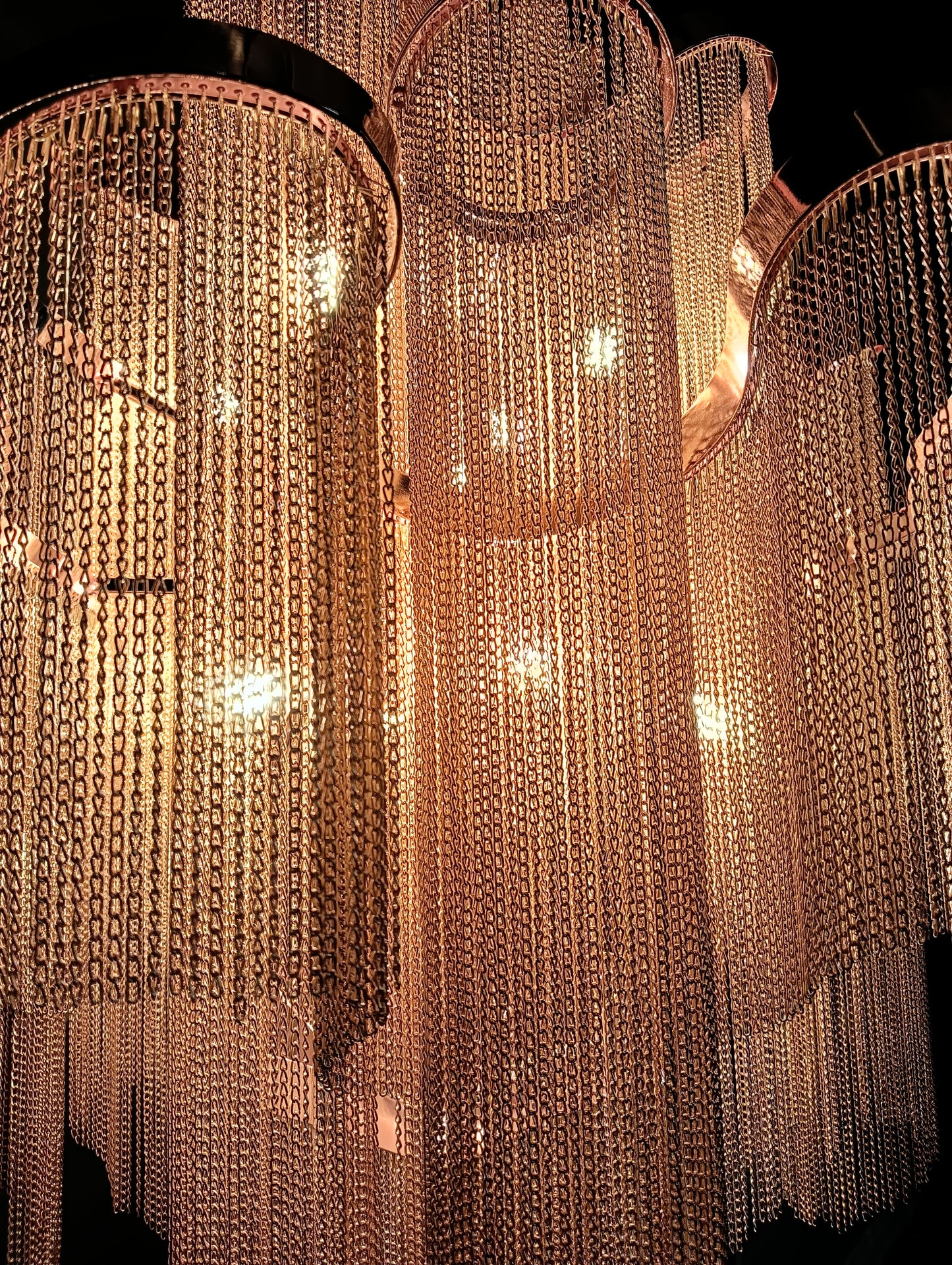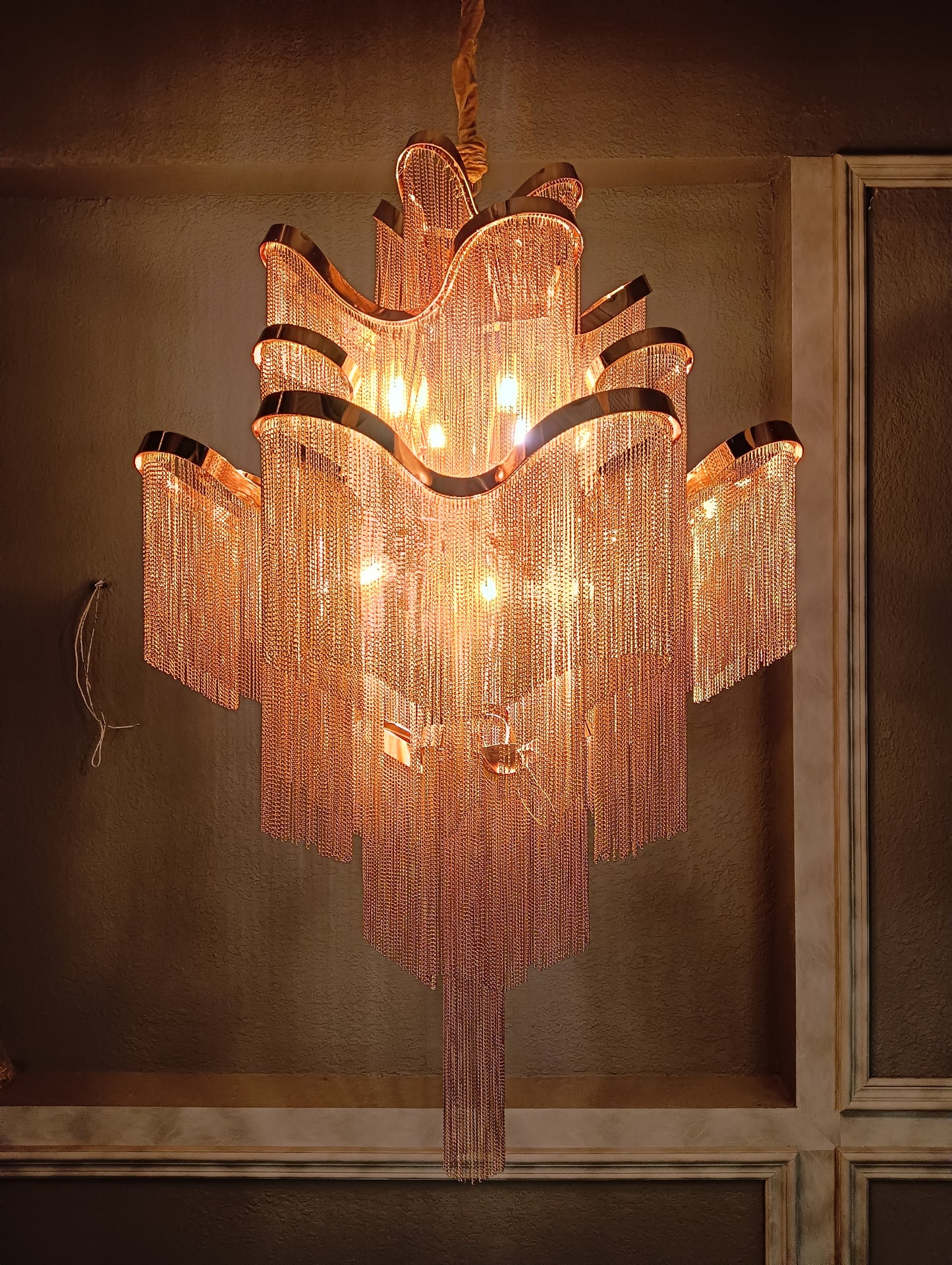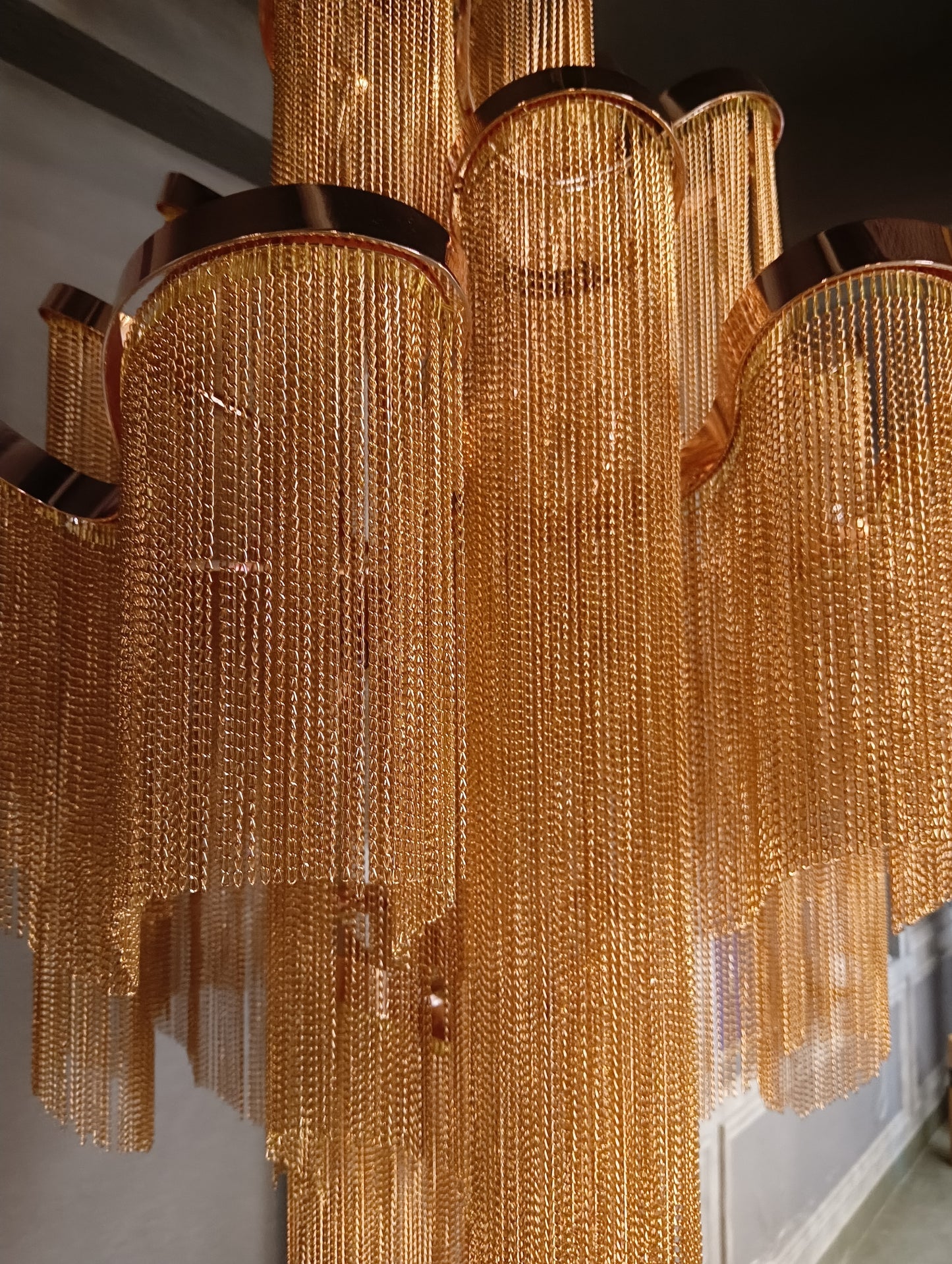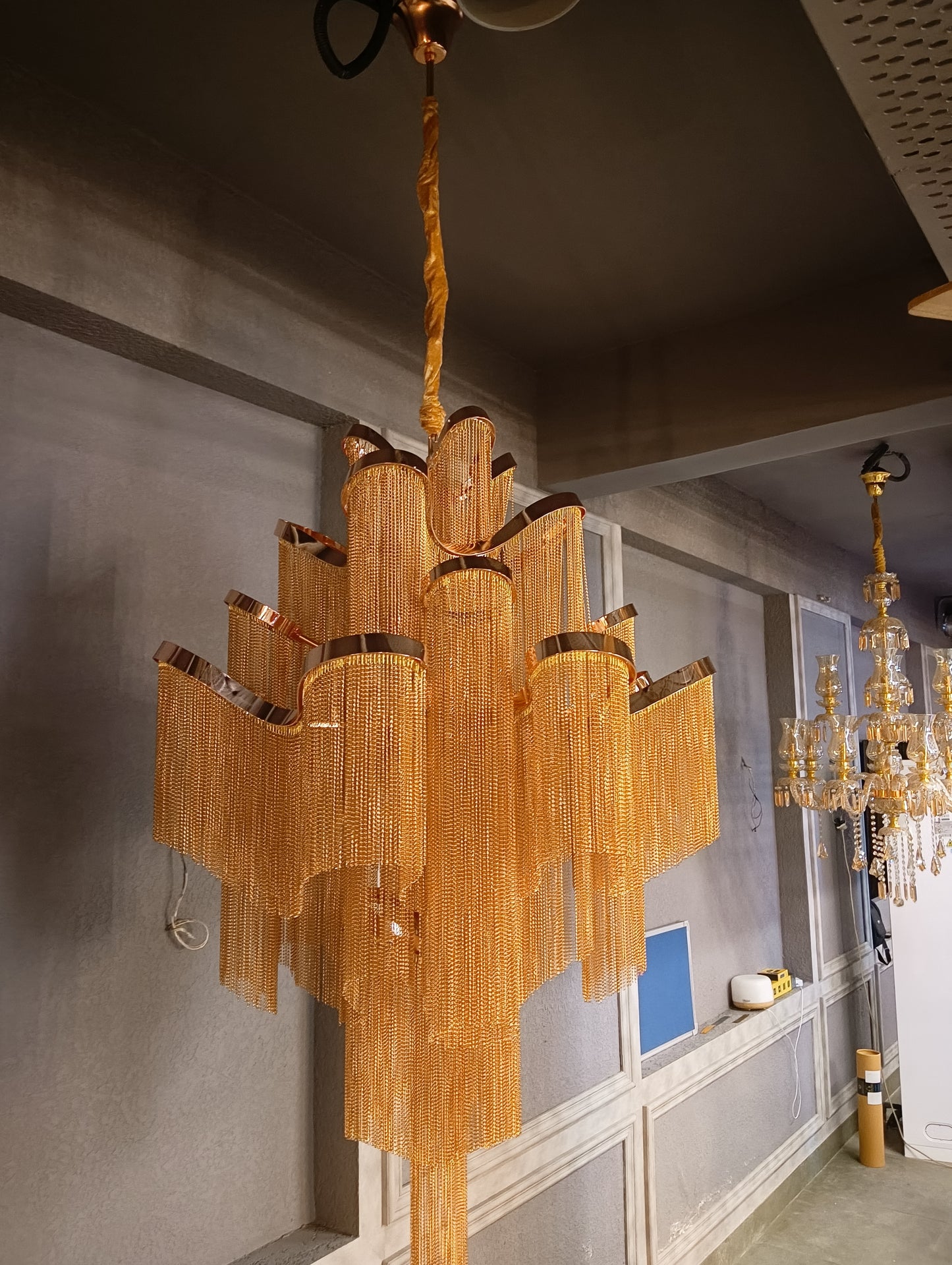 It is designed for luxury double-height spaces. Crafted from durable metal with a golden finish, it measures D800 × H1270 mm and supports E14 bulbs (purchased separately). Its tiered structure and warm white illumination create a regal centerpiece for villas, banquet halls, and hotel lobbies. Combining grandeur with elegance, the Imperial Crown enhances interiors with golden brilliance and timeless sophistication.