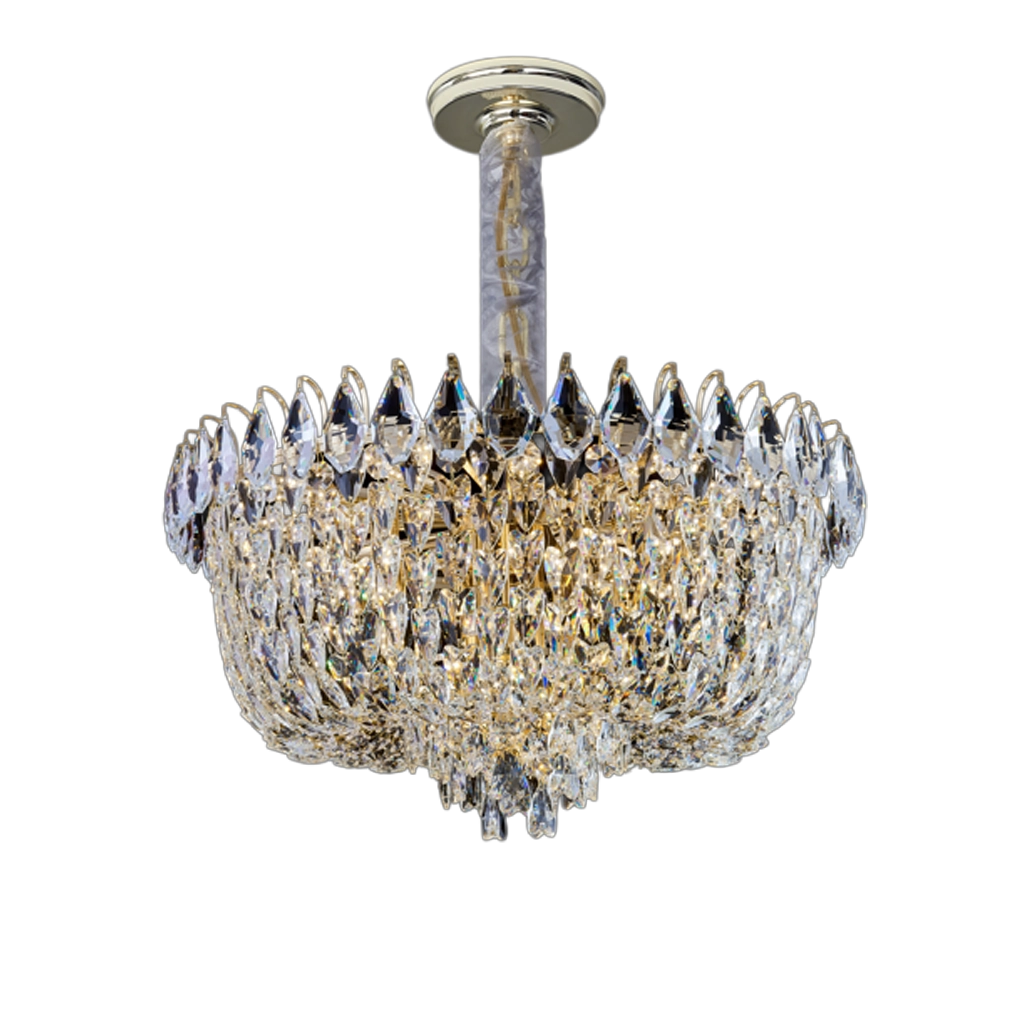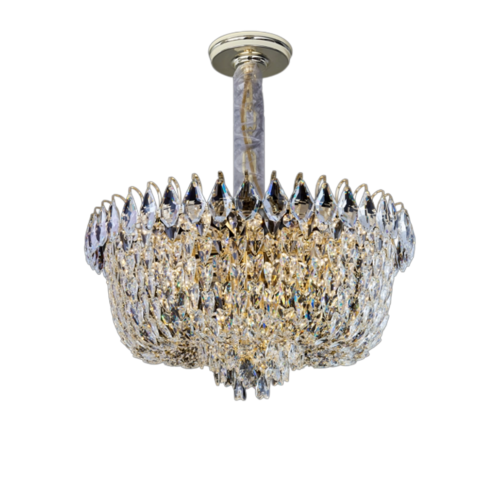 Radiant Crown Round is structured around circular balance. Layered crystal elements are arranged along a continuous perimeter, allowing light to disperse evenly in all directions. The metal framework maintains proportion without visual weight, ensuring the chandelier reads as a cohesive architectural form. Illumination feels centred and calm, shaped by repetition and symmetry rather than sparkle. The round configuration reinforces stability when viewed from below.