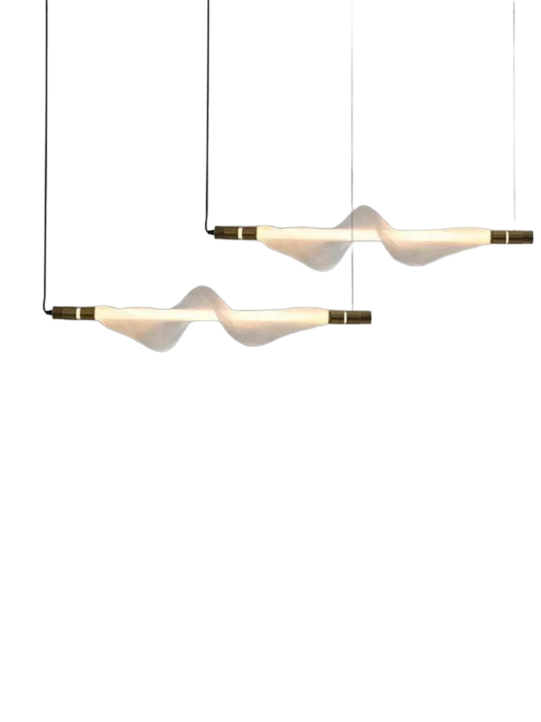 These hanging lights feature a fluid, curved ribbon design that adds unique sophistication to offices, living rooms, and hotels.